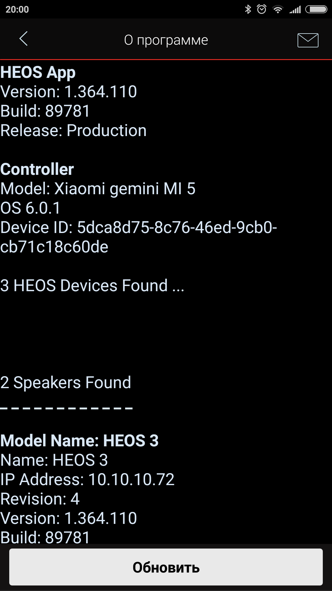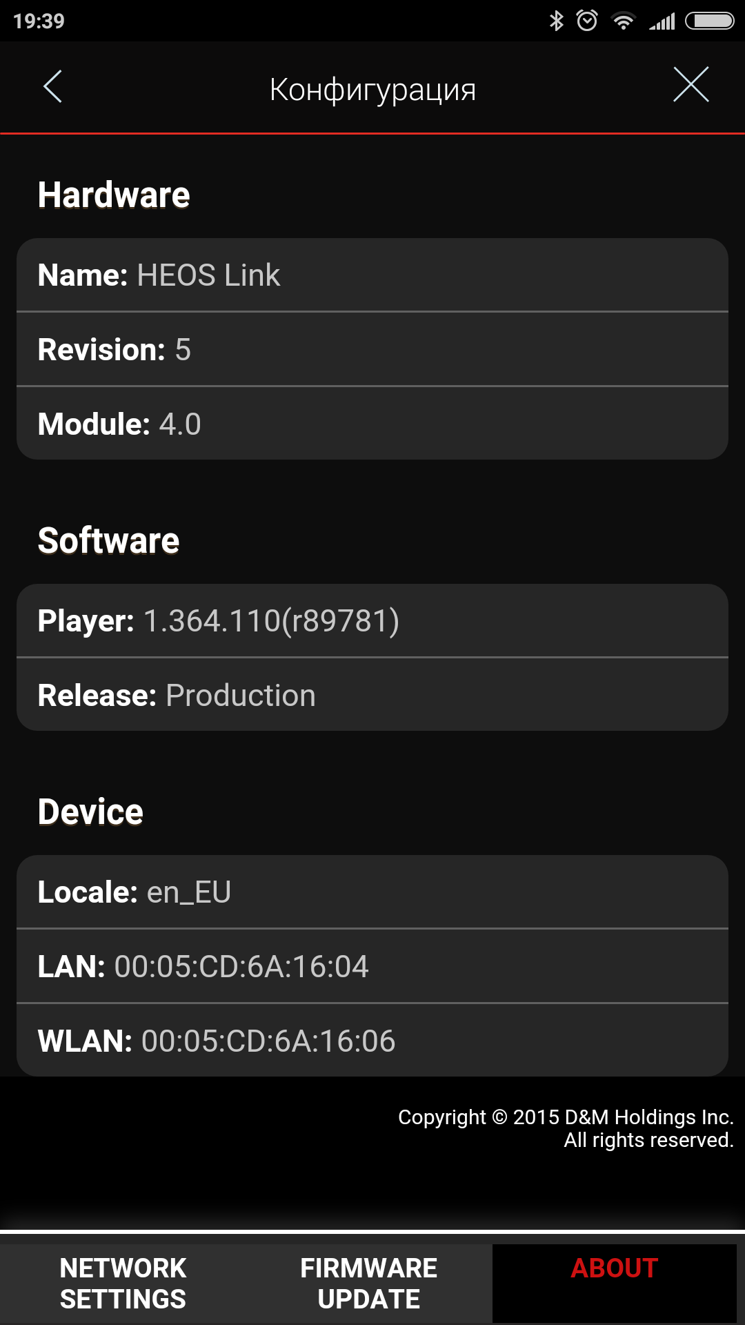 В дополнительных опциях предусмотрено отображение информации об устройстве (в том числе MAC-адресов и версий ПО), настройки сетевых адресов, проверка обновлений прошивки. Для Heos Amp дополнительно есть регулировка баланса и ограничение максимальной мощности.