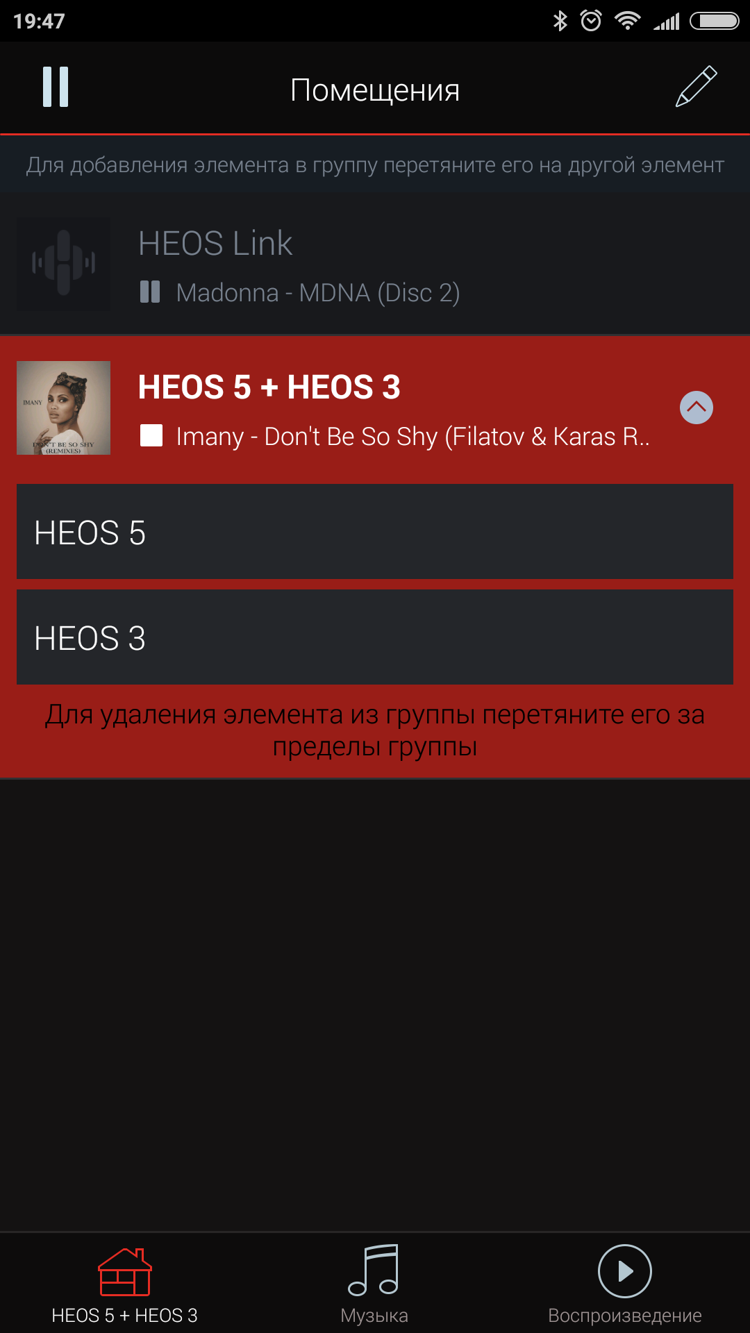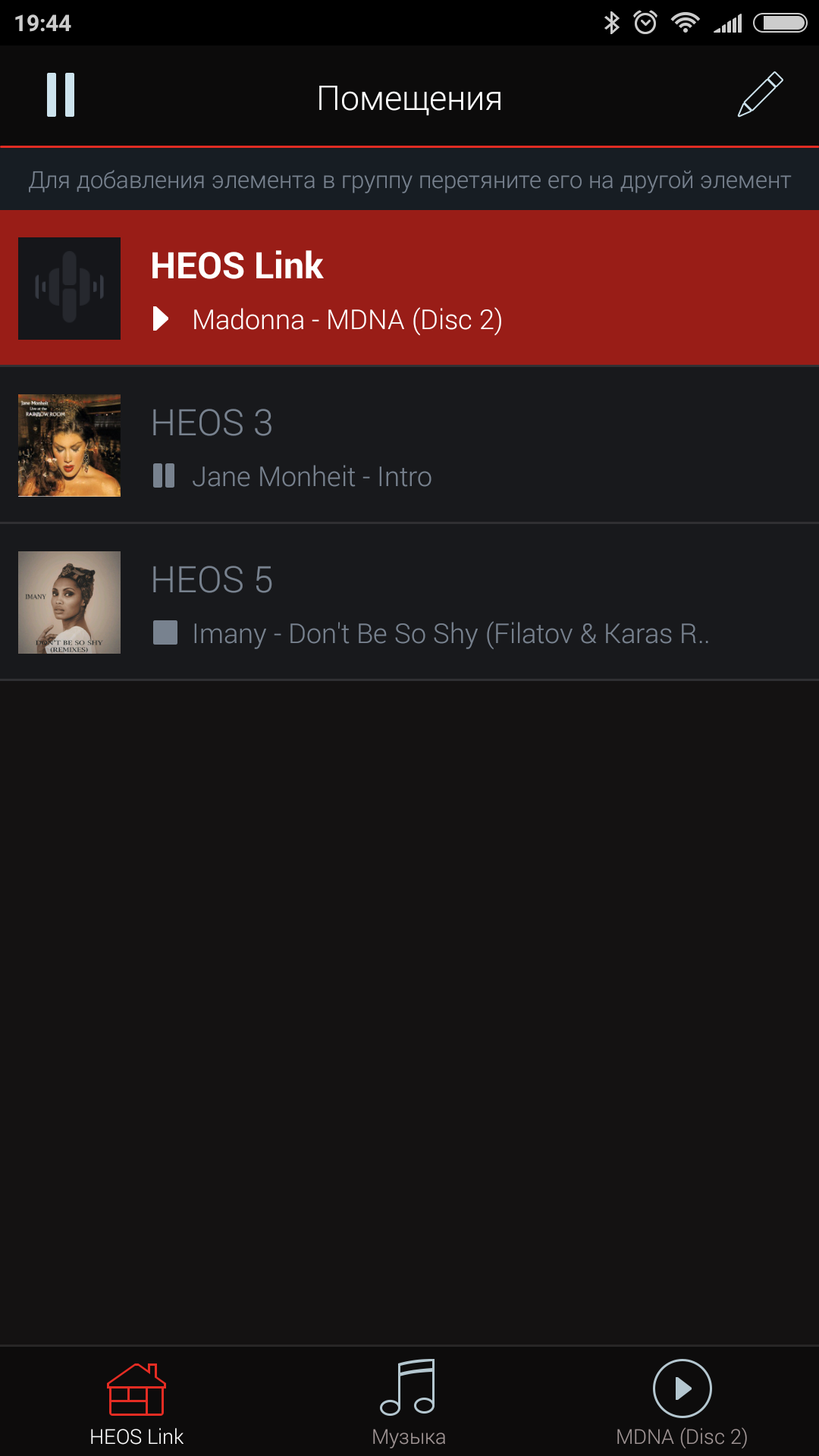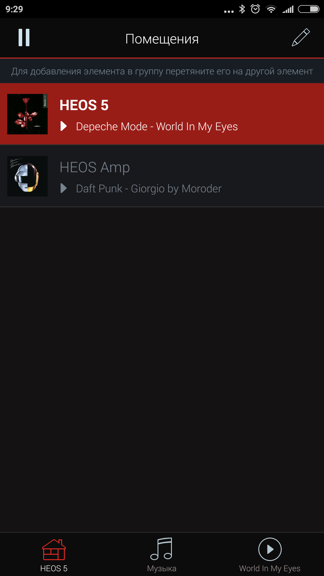 Основное окно утилиты имеет три страницы. На первой, которая озаглавлена «Помещения», представлены все найденные в локальной сети колонки и их состояние. В верхней строке есть кнопка быстрой остановки (постановки на паузу) всех устройств сразу и значок для вызова меню изменения названий колонок. Перед переходом на вторую или третью страницы нужно на первой выбрать управляемое устройство или группу. Последние организуются очень просто — перетаскиванием значка одного устройства на другое.