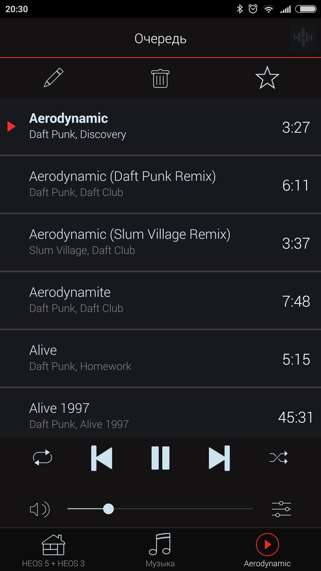 Третья страница аналогична привычным медиаплеерам: в центре — лого трансляции или обложка альбома, а под ней находятся кнопки управления воспроизведением и громкостью. Дополнительно можно выбрать индивидуальные уровни для устройств группы, изменить порядок проигрывания (если речь об альбомах или плейлистах). Значок в правом верхнем углу позволяет добавить поток в избранное, знак в левом верхнем углу — управлять списком воспроизведения.