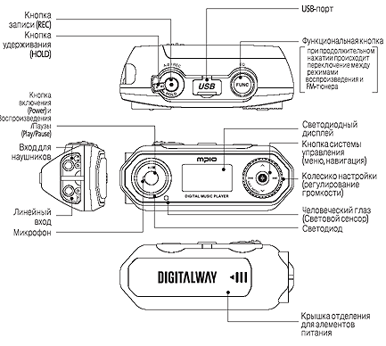 Выше приведена схема раскладки новинки ряда MPIO. В принципе, большинство элементов уже знакомы нам по другим плеерам, теперь лишь изменился их внешний вид и расположение, дабы соответствовать внешнему виду магнитолы. Особо хочется отметить оригинальные конструкторские решения, в частности — регулировку громкости при помощи вращающегося колесика, «замаскированного» под правый динамик. Слева такого нет, зато по окружности «динамика» расположен светодиод, который может мелькать в такт музыке (это можно и отключить). Кроме того, на схеме хорошо виден линейный вход: кроме плеера и радиоприемника, присутствует и онлайн-кодер, способный оцифровывать звук с линейного входа или встроенного микрофона (прощай ADPCM в диктофонных записях).