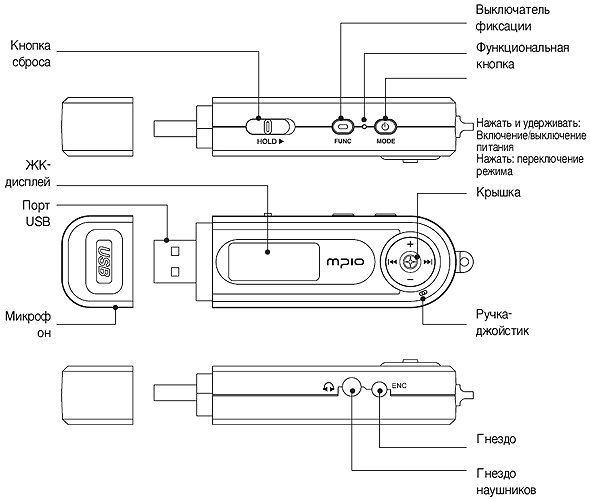Сильно изменилось расположение и назначение кнопок — в частности, на новом плеере вообще нет таких клавиш, как Play, Pause или Stop. Вообще, схема управления больше похожа на DMK или DMB/DMB Plus — с джойстиком, что, на мой взгляд, удобнее, нежели куча кнопок в FY200. Интересно, что на схеме в русском руководстве подписи к основным частям плеера смешаны, так что можете сыграть в интересную игру «Художник кое-что перепутал» :) Впрочем, разобраться, где что по схеме разделки плеера, несложно, посему и привожу ее здесь без изменений.