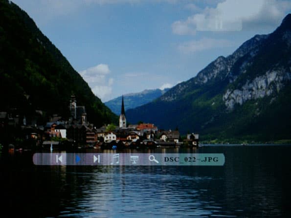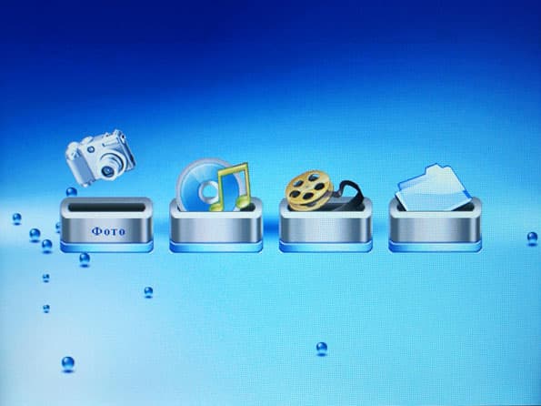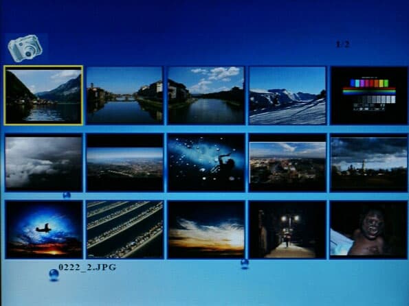 Итак, сейчас нас интересует просмотр фотографий. Выбрав в меню режим «Фото», мы видим мозаику из 15-ти маленьких изображений, которые постепенно подгружаются на экран. Это все изображения, которые устройство обнаружило на выбранном носителе. Кнопками вверх/вниз/влево/вправо можно выбрать интересующее нас фото и нажать ОК. Оно разворачивается на полный экран. Нажав кнопку ОК, мы запускаем слайд-шоу, нажав ее еще раз — ставим его на паузу, об этом говорит небольшая прозрачная пиктограмма на экране.