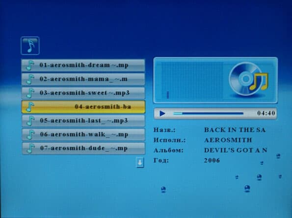 Рамка способна воспроизводить популярные форматы — MP3 и WMA. К сожалению (хоть и небольшому) никаких сюрпризов в плане поддержки не заявленных типов файлов в данном случае нет.