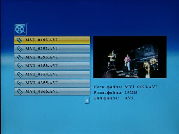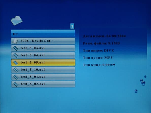Браузер видео достаточно удобен. Справа от списка файлов отображается окошко, в котором проигрывается выделенный ролик. Ниже этого окошка имеется некоторая информация о ролике — название файла (непонятно, зачем — оно ведь есть в списке), его размер в Мбайтах, а также тип. Если открывать видео не из режима «Видео», а из общего браузера файлов, то можно узнать и о кодеке изображения и звука, и длительность, и дату изменения (по сути, дату записи, если ролик не подвергался редактированию).