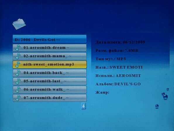 Доступ к музыке можно получить, опять же, выбрав сначала тип памяти, а затем режим «Музыка», либо из общего браузера файлов. В первом случае отображаются вообще все музыкальные файлы, найденные в памяти, единым списком. Во втором можно бродить по директориям. При этом справа также имеется область, где показывается информация о файле: дата изменения, размер файла в Мбайтах, формат, название композиции, имя исполнителя, название альбома, жанр. Никакой библиотеки, где можно осуществлять фильтрацию по тому или ному полю, нет, есть только этот браузер файлов.