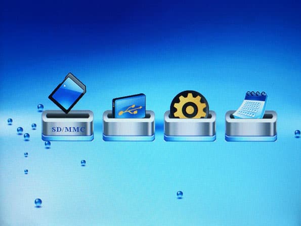 Далее поговорим о том, как устроен сам процесс просмотра. Итак, когда рамка включилась, нам предлагается выбрать источник фотографий — какую-нибудь из карт памяти, либо встроенную, либо зайти в настройки. Выбрав тип памяти, передвигаемся далее — предлагается выбрать тип контента, который мы хотим смотреть: фотографии, музыку или видео. Последним пунктом идет браузер файлов. Если выбрать что-нибудь из первых трех пунктов, то все файлы выбранного типа сваливаются в кучу и предстают перед нами либо в виде превьюшек (в случае с фото), либо в виде списка файлов (в случае с видео или музыкой). Браузер же предоставляет нам доступ ко всем файлам из памяти.