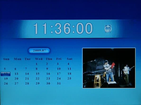 В главном меню помимо уже описанных функций присутствует еще и календарь. Он отображает текущий месяц, дату и год, вверху имеются часы с достаточно крупными цифрами, хотя можно было сделать их еще крупнее, позаботясь о близоруких. Рядом с календарем отображается окошко, в котором показывается слайдшоу из фотографий, обнаруженных в памяти, внешней или внутренней. Календарь можно включить вручную, но если же вы в течение 5-ти минут с устройством не совершили никаких действий, он включается автоматически.