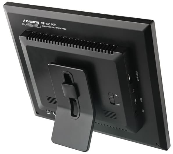 Рамка достаточно устойчиво стоит на столе. Если на нее немного надавить сверху, фиксатор подставки смещается, у него слишком свободный ход, но это уже мелкие придирки. Подставка может быть повернута так, чтобы устройство имело портретную ориентацию. Но использовать ее в таком режиме не позволит как минимум надобность вручную менять ориентацию фотографий при каждом просмотре, как максимум — будет некрасиво повернута надпись Digma и декоративная полоска окажется не на своем месте. Таким образом, раз уж в вертикальном положении рамка вряд ли будет использоваться, было бы неплохо нижнюю часть снабдить резиновыми подставочками, дабы какой-нибудь проказник типа домашнего животного не скинул случайно рамку на пол.