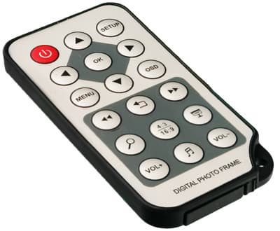 Пульт имеется в комплекте, и позволяет совершать гораздо больше действий, чем при помощи одной только лицевой панели самой рамки, да и вообще с ним управляться гораздо удобнее. Он очень маленький, тонкий, но при этом достаточно комфортный для использования. Кнопки нажимаются со щелчком, достаточно упругие. При управлении следует более-менее точно целиться в инфракрасный приемник на самой рамке, в ином случае нажатие не обработается.