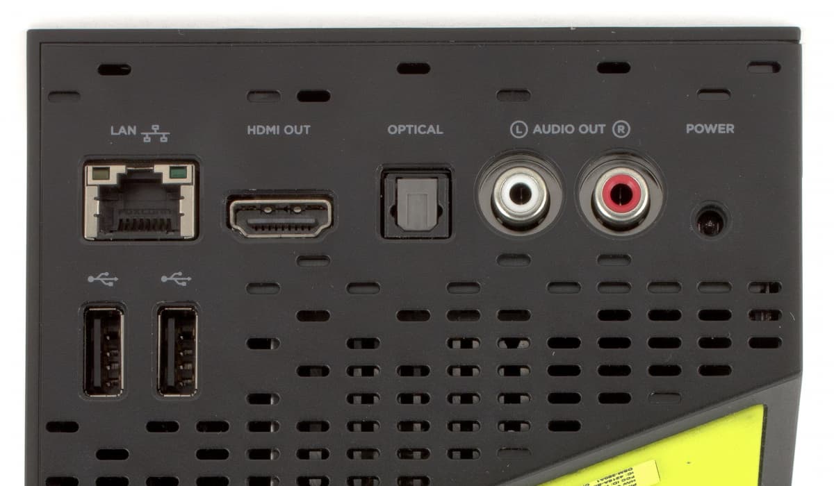 На правом торце разместился слот для карт памяти SD/SDHC/MMC с индикатором активности, а все остальные разъемы — сзади. Набор обычный — питание, HDMI, оптический цифровой аудиовыход, аналоговый стереоаудиовыход, сетевой порт, два порта USB 2.0. Остальную поверхность панели занимает решетка вентиляции. Единственная кнопка на самом плеере — включение питания. Для нее нашлось место на верхней стороне корпуса.
