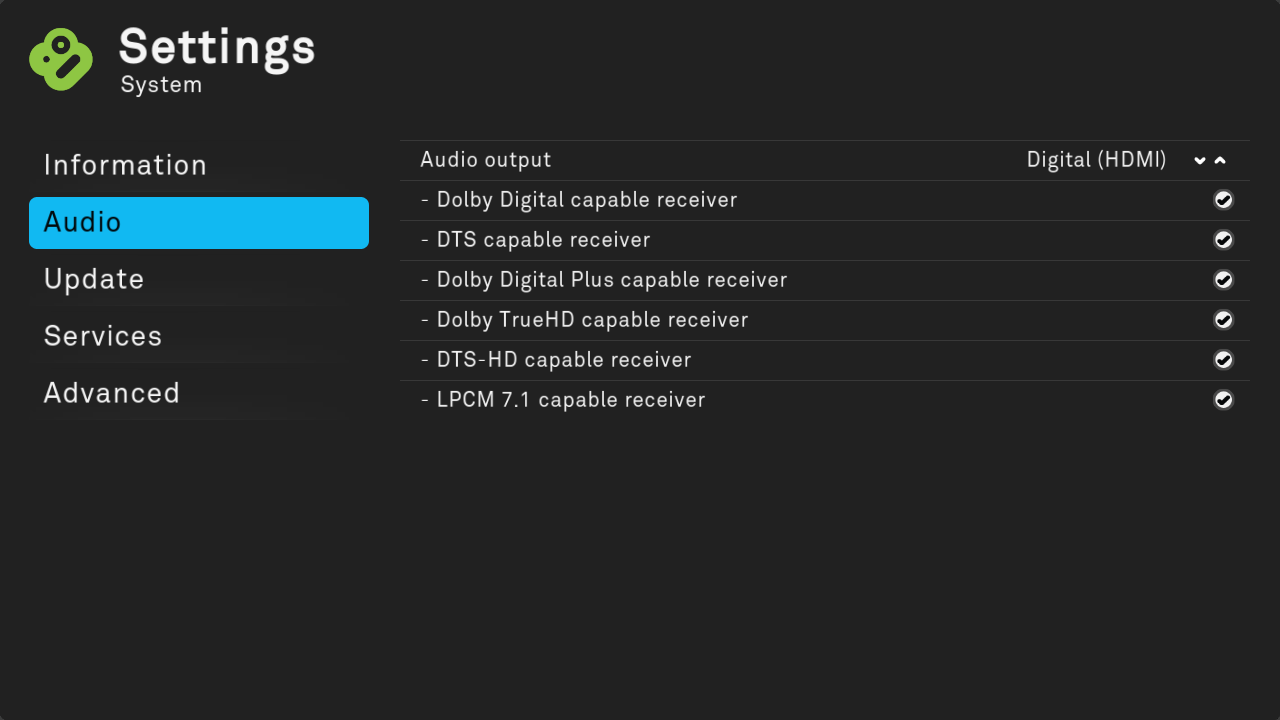 В «System» есть важная страница по указанию параметров вывода звука. Пользователь может выбрать один из вариантов — HDMI, S/PDIF, аналог или «все сразу». В последнем случае звук будет только стерео. Для цифровых режимов надо указать возможности вашего ресивера по декодированию аудиопотоков разных форматов, включая HD. Подробно этот вопрос мы изучим в практической части. В этой же группе есть страничка с указанием текущей версии прошивки, названия устройства, серийного номера и MAC-адресов. Проверка и установка новой версии прошивки может осуществляться напрямую через интернет. Предусмотрен и аварийный способ восстановления прошивки с USB-накопителя.