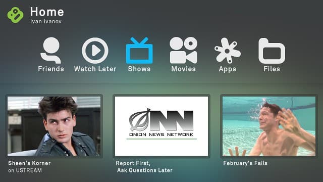 Начинается навигация с домашнего экрана. На нем находятся крупные значки для перехода к публикациям из социальных сетей («Friends»), списку «Посмотреть позже» (в него можно добавлять ссылки из файлового браузера или онлайновых сервисов), ТВ шоу, фильмам, приложениям и файлам. В нижней части окна — три рекомендованных ролика от Boxee и партнеров (например, наиболее популярные сегодня на YouTube).