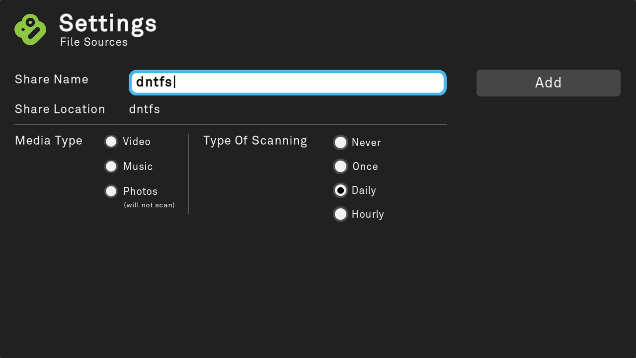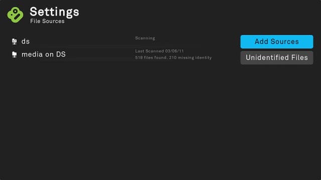 Отдельная страница, «File Sources», используется для указания локальных (с USB-накопителей) и сетевых ресурсов для индексации плеером. Около каждого из них приводятся данные о найденных медиафайлах.