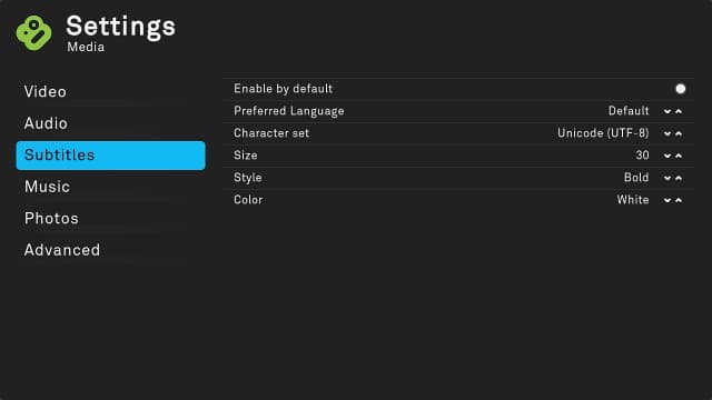 «Media» отвечает за настройку видеофильтров, предпочтительного языка звуковой дорожки, размера, цвета и языка субтитров, параметров слайд-шоу для фотографий.