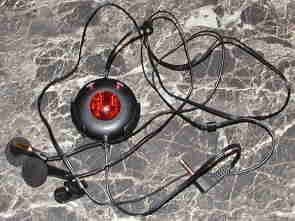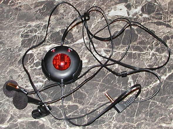 Итак, приемник. Названия не имеет :) Прост до ужаса. Диск из черной пластмассы с красным выпуклым стеклышком спереди. Через него можно увидеть внутренности устройства, а при работе оно светится (выглядит это достаточно симпатично). Кроме того спереди имеются две маленькие кнопочки: "Reset" и "Seek". Первая сбрасывает настройку приемника на 88 МГц (приемник работает в стандартном диапазоне 88-108 МГц), вторая предназначена для поиска радиостанций. Снизу торчит шнур со штекером типа mini-jack для подключения к плееру (впрочем, приемник можно использовать и отдельно), сверху — наушники. Обычные "затычки", но классом несколько повыше, чем обычно прилагающиеся к плеерам. К сожалению, наушники такой конструкции у меня в ушах плохо держатся, но многим они вполне подойдут. Сзади у прибора имеется два ползунка: выключатель и регулятор громкости, а также крышка батарейного отсека. Питается это все от одной литиевой батарейки типа CR2032, которой хватает очень надолго, ибо энергопотребление мизерное. Есть еще зажим на провод (чтоб не болтался как попало) и пластиковый чехол для приемника, чтоб на карман его повесить (при этом прием, как правило, лучше, чем если в кармане самом его держать).