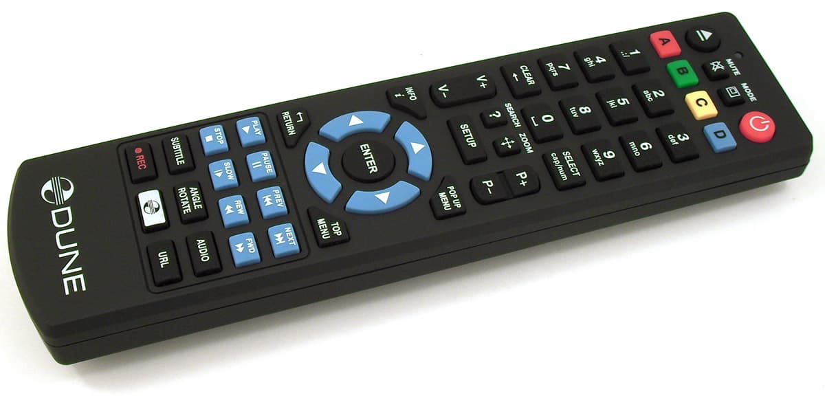 Пластмасса, из которой изготовлен корпус пульта ДУ, на ощупь напоминает очень жёсткую матовую резину. В верхней его части имеется тусклый красный светодиод, подмигивающий при нажатиях. Всем был бы хорош данный пульт, измени разработчик положение клавиш, отвечающих за воспроизведение. Нынешнее их расположение нельзя назвать удобным и логичным. Впрочем, привыкнуть к такому размещению не составляет особой сложности.