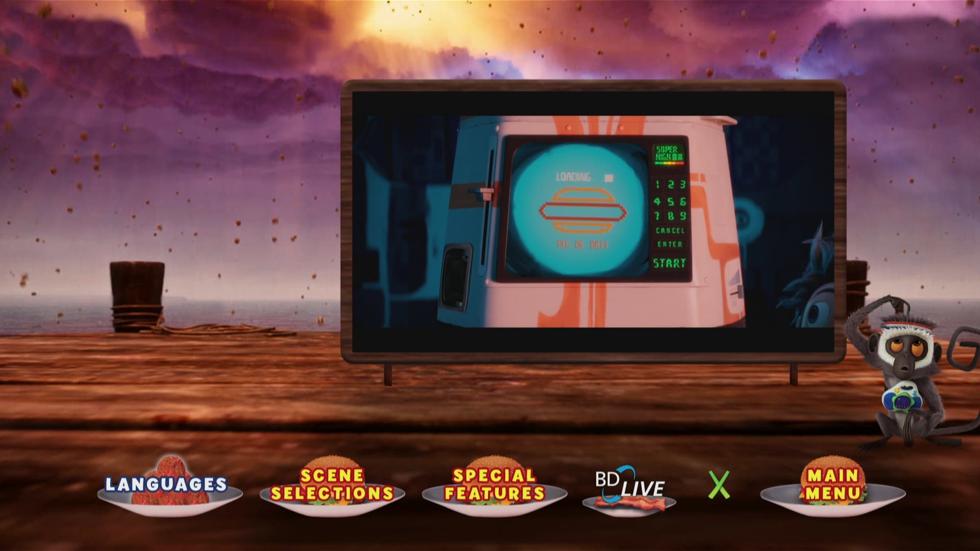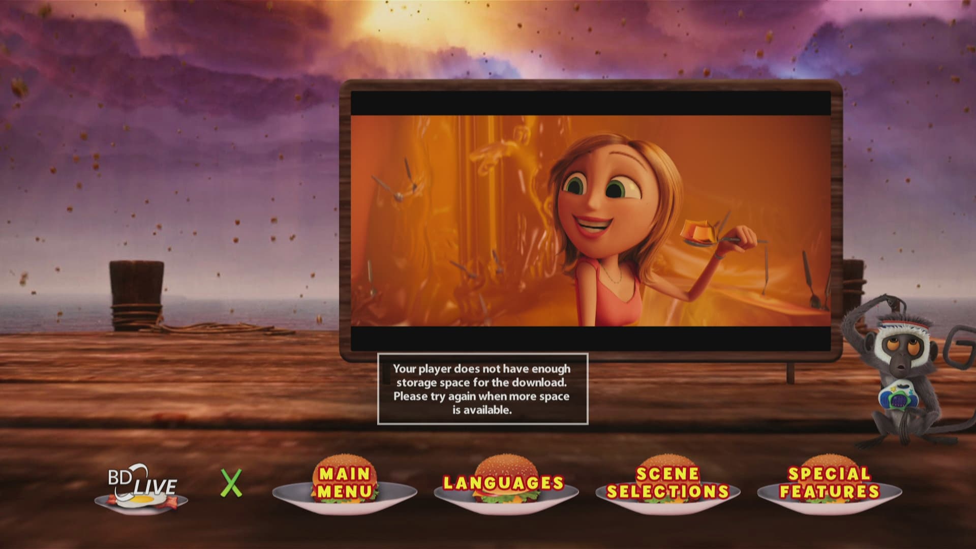 В заключение обратимся к одной любопытной технологии, имеющейся в Blu-ray-дисках. Не во всех, конечно, а лишь в некоторых. Нетрудно догадаться, чьего производства эти диски. Технология эта называется BD-Live (Blu-ray Disc — Live), она разработана и запатентована корпорацией Sony. Назначение её заключается в осуществлении доступа к интерактивным развлечениям: интернет-играм, конкурсам и прочим web-сервисам. Также с её помощью пользователь может получить дополнительные материалы о фильме, которых нет на имеющемся у него диске. К счастью, у нас нашёлся один такой Blu-ray-диск (признаться, он же и единственный «настоящий» BD) — мультфильм о фрикадельках в формате Blu-ray 3D. Эти 3D функции в нашем плеере, конечно же, не работают; к счастью, данный диск можно смотреть и в обычном 2D-формате.