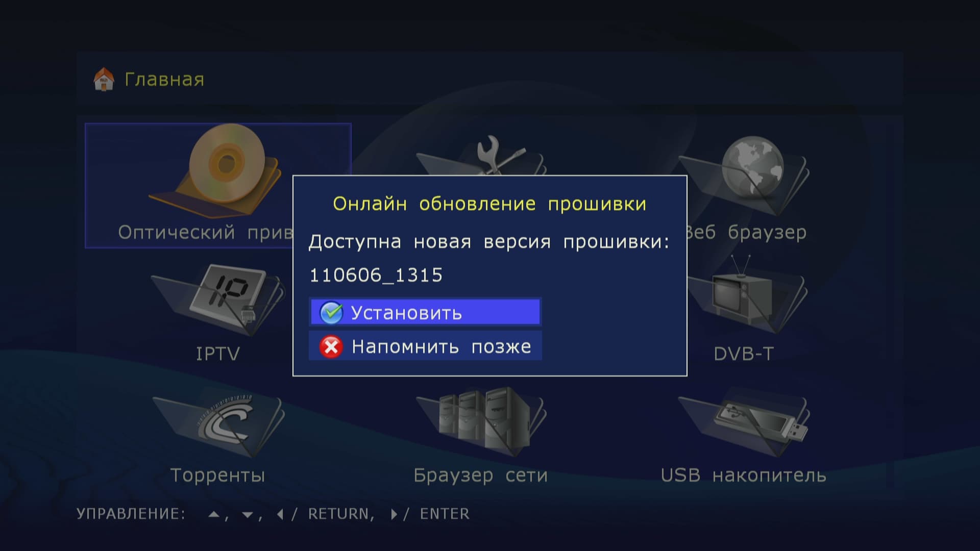При первом же включении плеера на экране появилось сообщение о доступности новой версии прошивки (по умолчанию в плеере была установлена версия 100828_0034). Но одного лишь соединения с интернетом для обновления недостаточно — плееру нужно куда-то скопировать загружаемый файл и лишь после этого заняться собственно установкой. Снова сталкиваемся с проблемой отсутствия хотя бы минимально необходимой памяти, встроенной в плеер (однако, начиная с данной прошивки, плееру теперь не будет нужен накопитель для обновления). А также с необходимостью занимать один из портов плеера под установку флешки или карты памяти в качестве накопителя, часто требующегося плееру для выполнения тех или иных задач (таких, как работа с BDLive! и прочих).