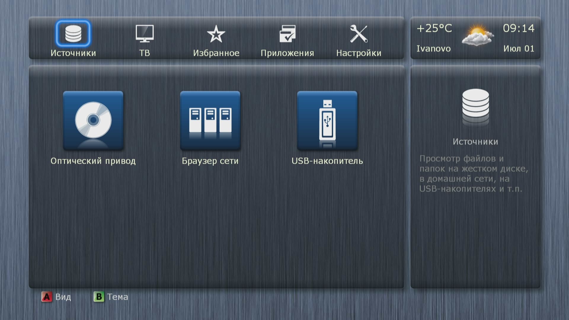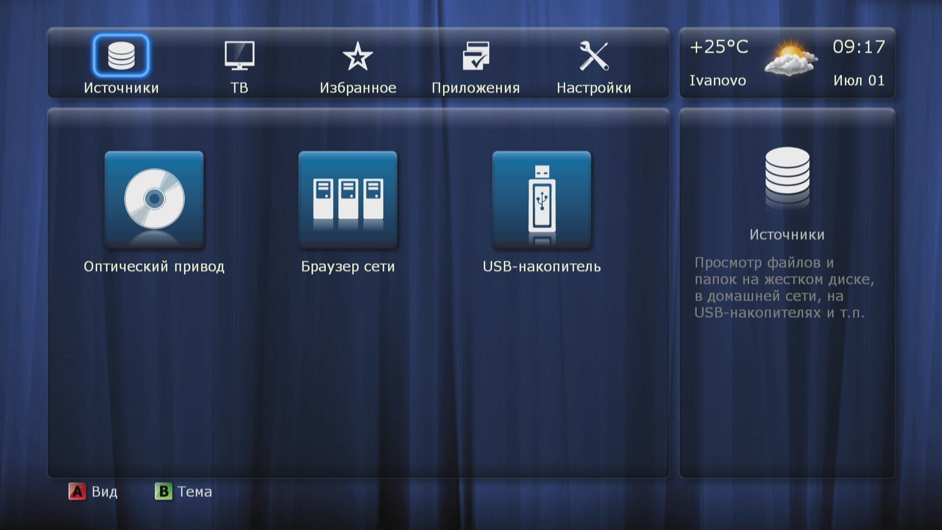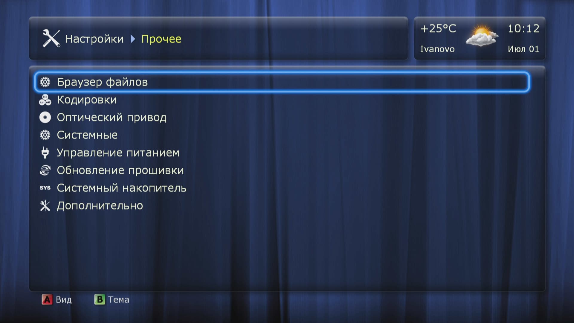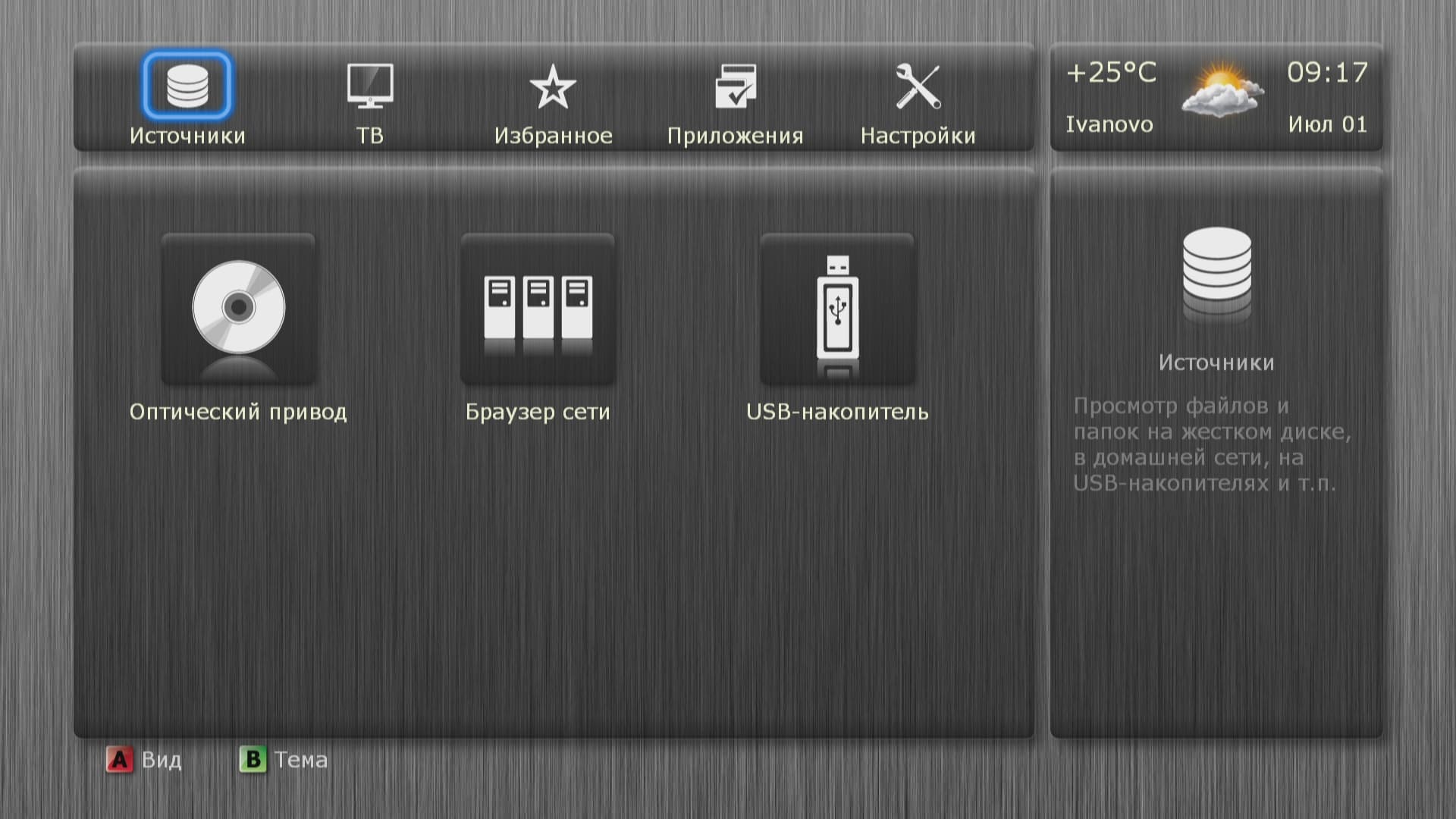 Здесь, как видим, главный браузер разбит на несколько окон, в двух из них осуществляется выбор носителя и контента, в третьем отображается текущее время и погода, а чётвёртое информационное окно содержит сведения о выбранном элементе. Внизу экрана можно наблюдать подсказку из двух пунктов. Она гласит о том, что в данной версии прошивки задействованы цветные кнопки, имеющиеся на ИК-пульте, обозначенные латинскими буквами A, B, C и D. Этими кнопками пользователь может на лету изменить способ отображения содержимого окна файлового браузера (иконки, список), а также изменить цветовую тему оформления на любую из восьми имеющихся. Перезагрузка после этого не требуется, все изменения происходят за считанные секунды.