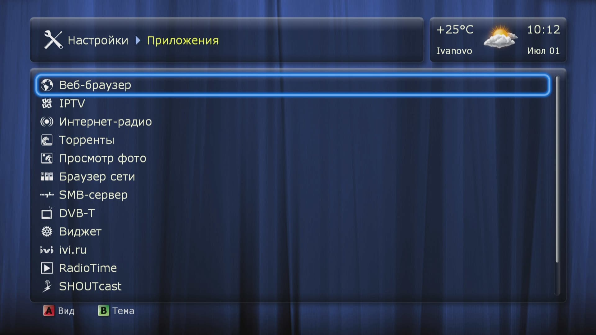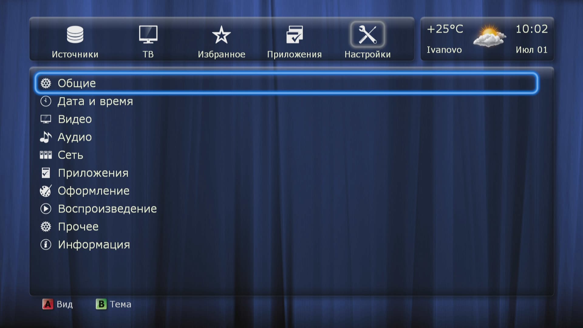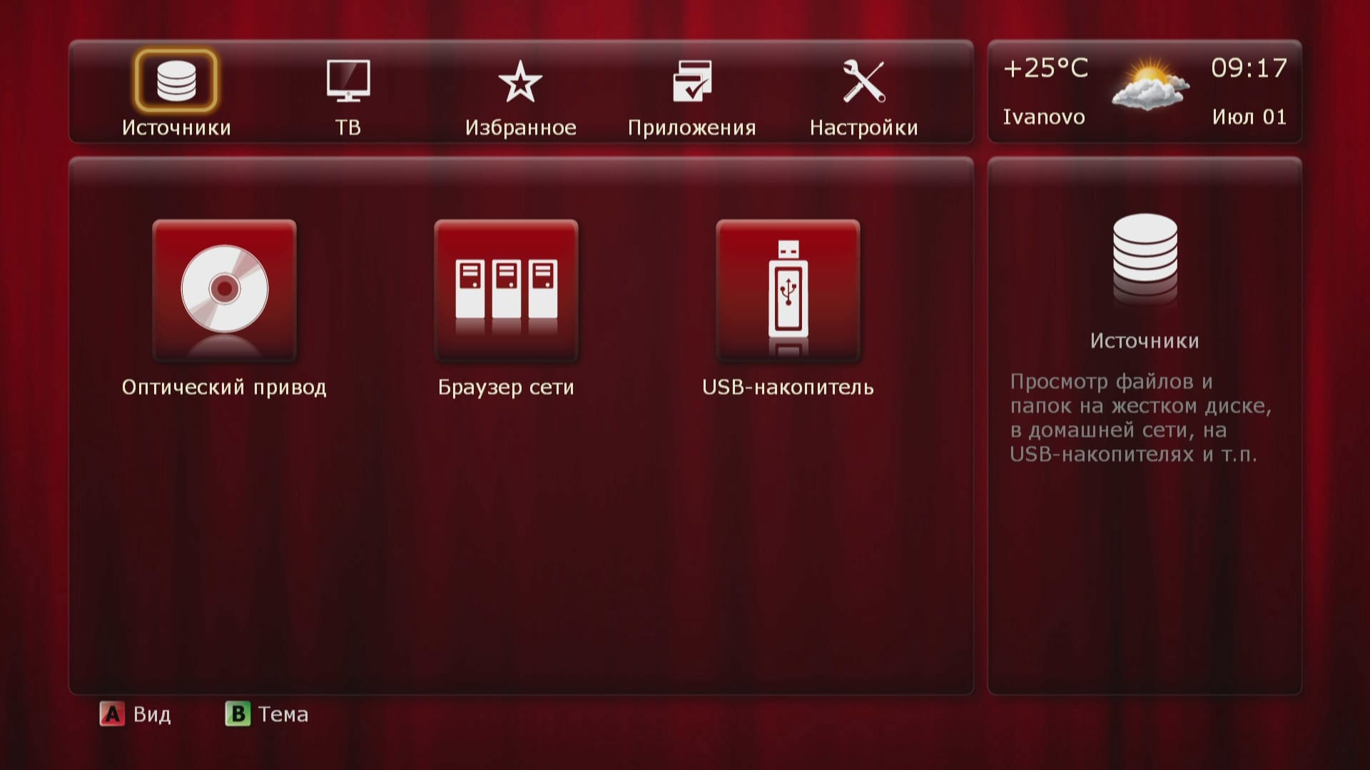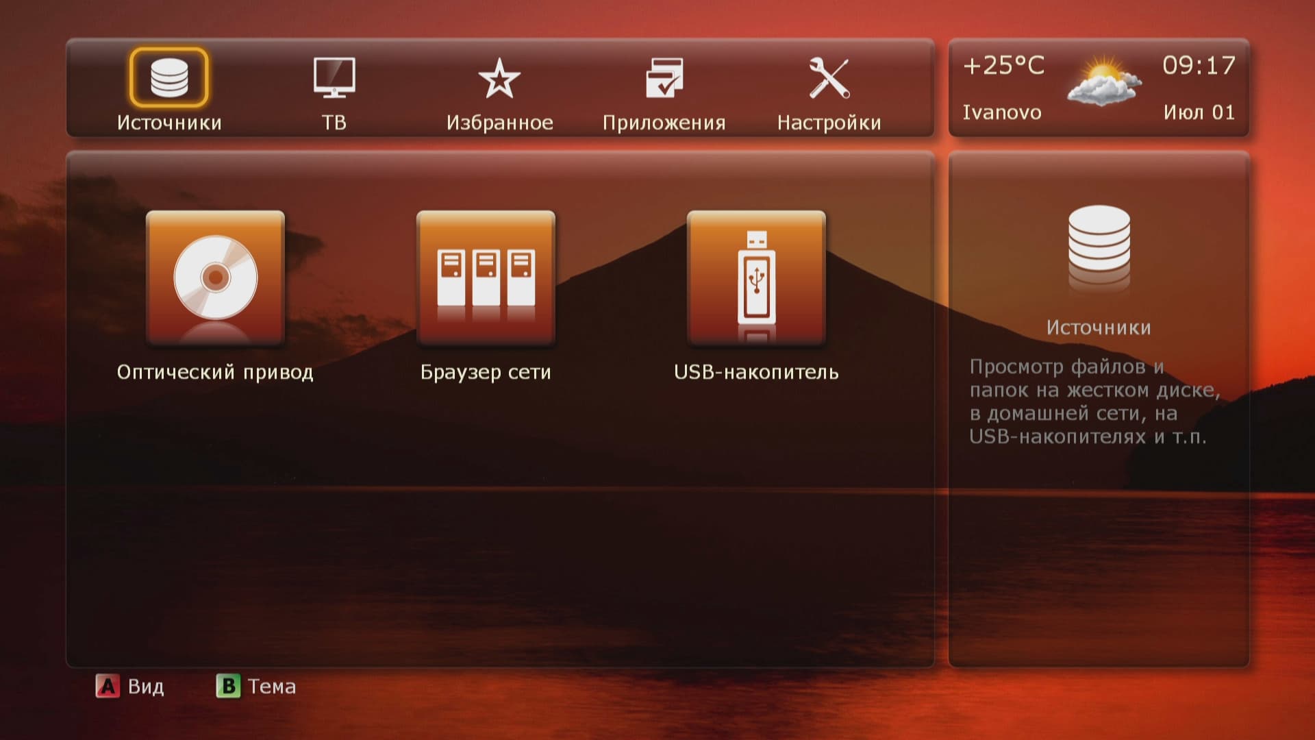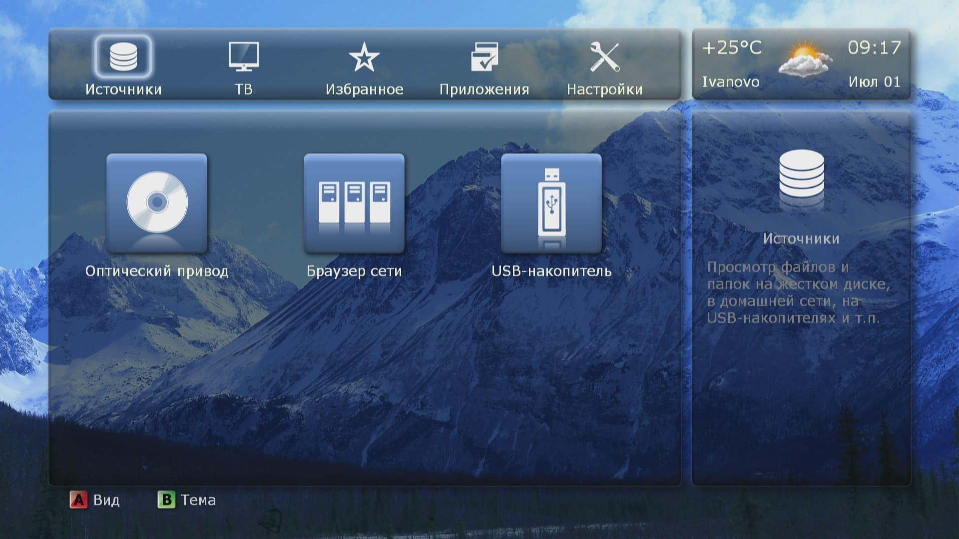 Здесь, как видим, главный браузер разбит на несколько окон, в двух из них осуществляется выбор носителя и контента, в третьем отображается текущее время и погода, а чётвёртое информационное окно содержит сведения о выбранном элементе. Внизу экрана можно наблюдать подсказку из двух пунктов. Она гласит о том, что в данной версии прошивки задействованы цветные кнопки, имеющиеся на ИК-пульте, обозначенные латинскими буквами A, B, C и D. Этими кнопками пользователь может на лету изменить способ отображения содержимого окна файлового браузера (иконки, список), а также изменить цветовую тему оформления на любую из восьми имеющихся. Перезагрузка после этого не требуется, все изменения происходят за считанные секунды.