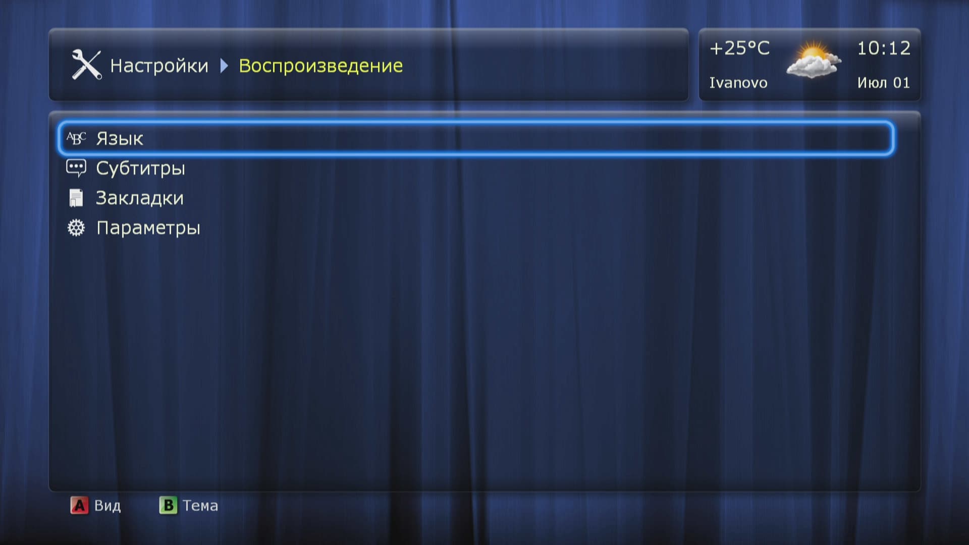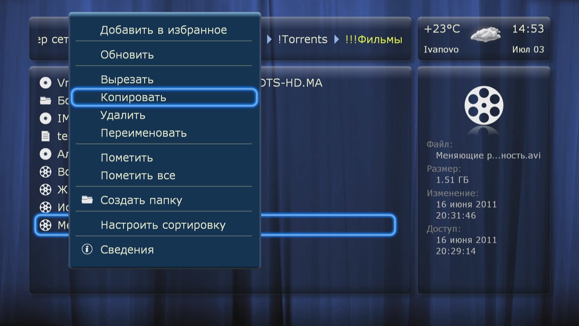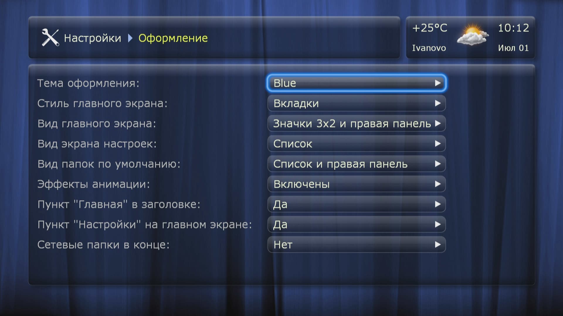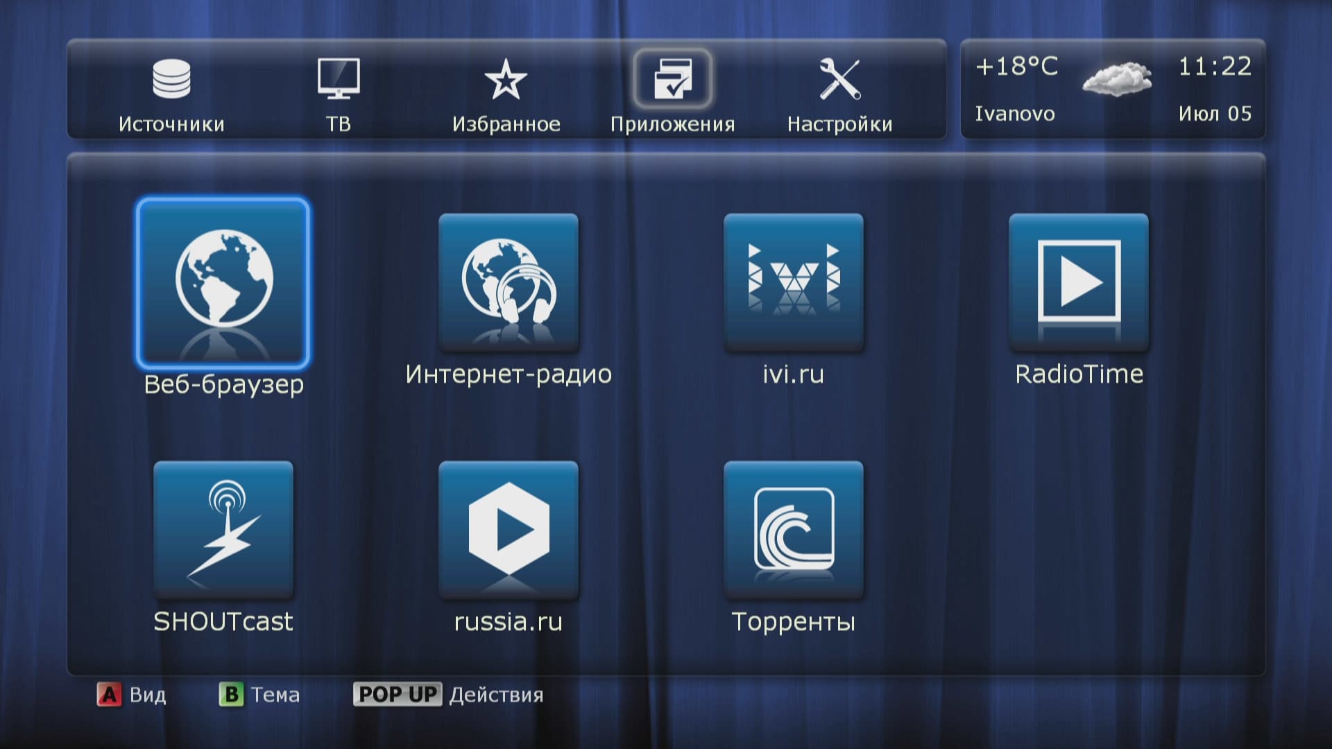 Здесь, как видим, главный браузер разбит на несколько окон, в двух из них осуществляется выбор носителя и контента, в третьем отображается текущее время и погода, а чётвёртое информационное окно содержит сведения о выбранном элементе. Внизу экрана можно наблюдать подсказку из двух пунктов. Она гласит о том, что в данной версии прошивки задействованы цветные кнопки, имеющиеся на ИК-пульте, обозначенные латинскими буквами A, B, C и D. Этими кнопками пользователь может на лету изменить способ отображения содержимого окна файлового браузера (иконки, список), а также изменить цветовую тему оформления на любую из восьми имеющихся. Перезагрузка после этого не требуется, все изменения происходят за считанные секунды.