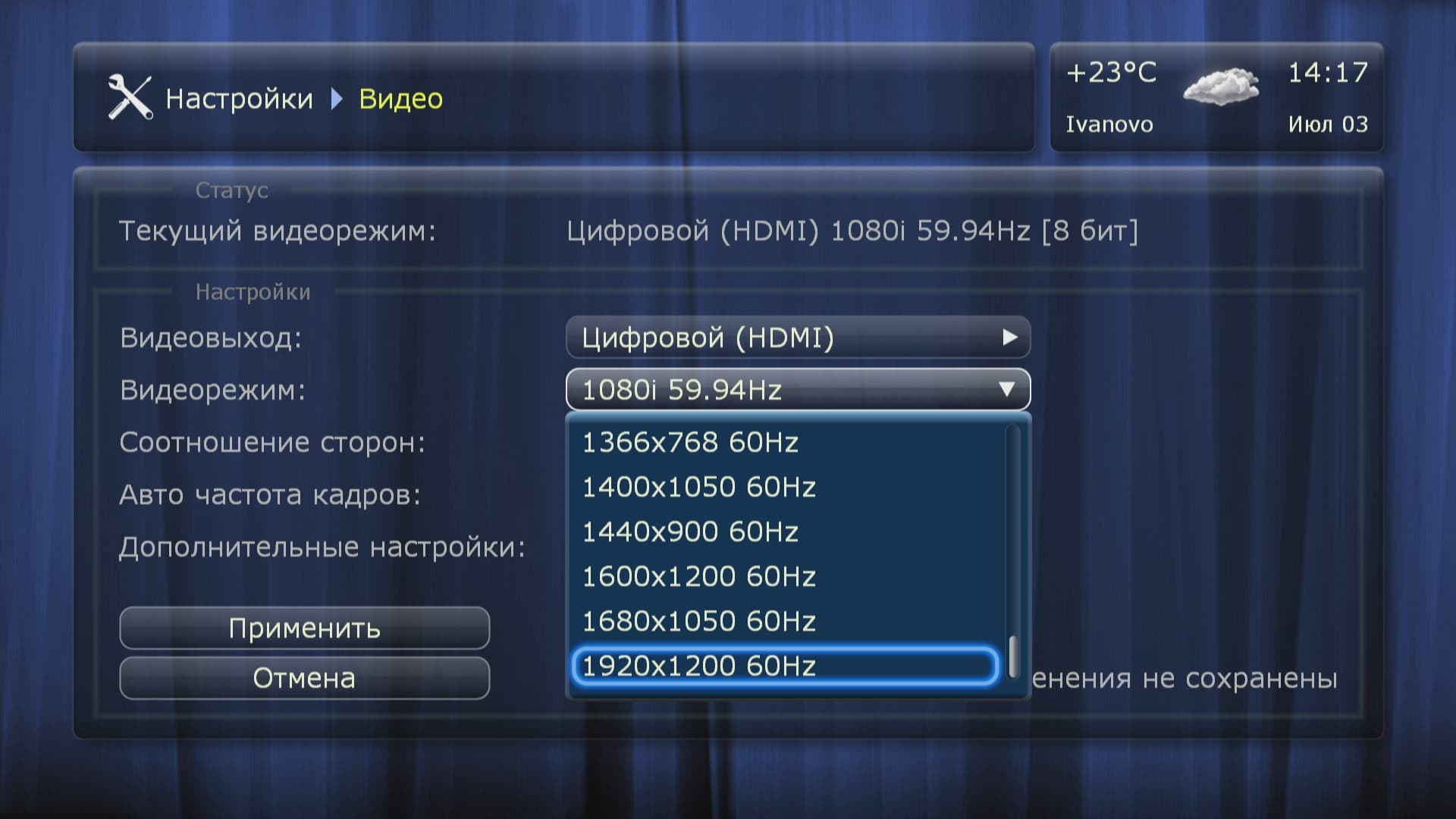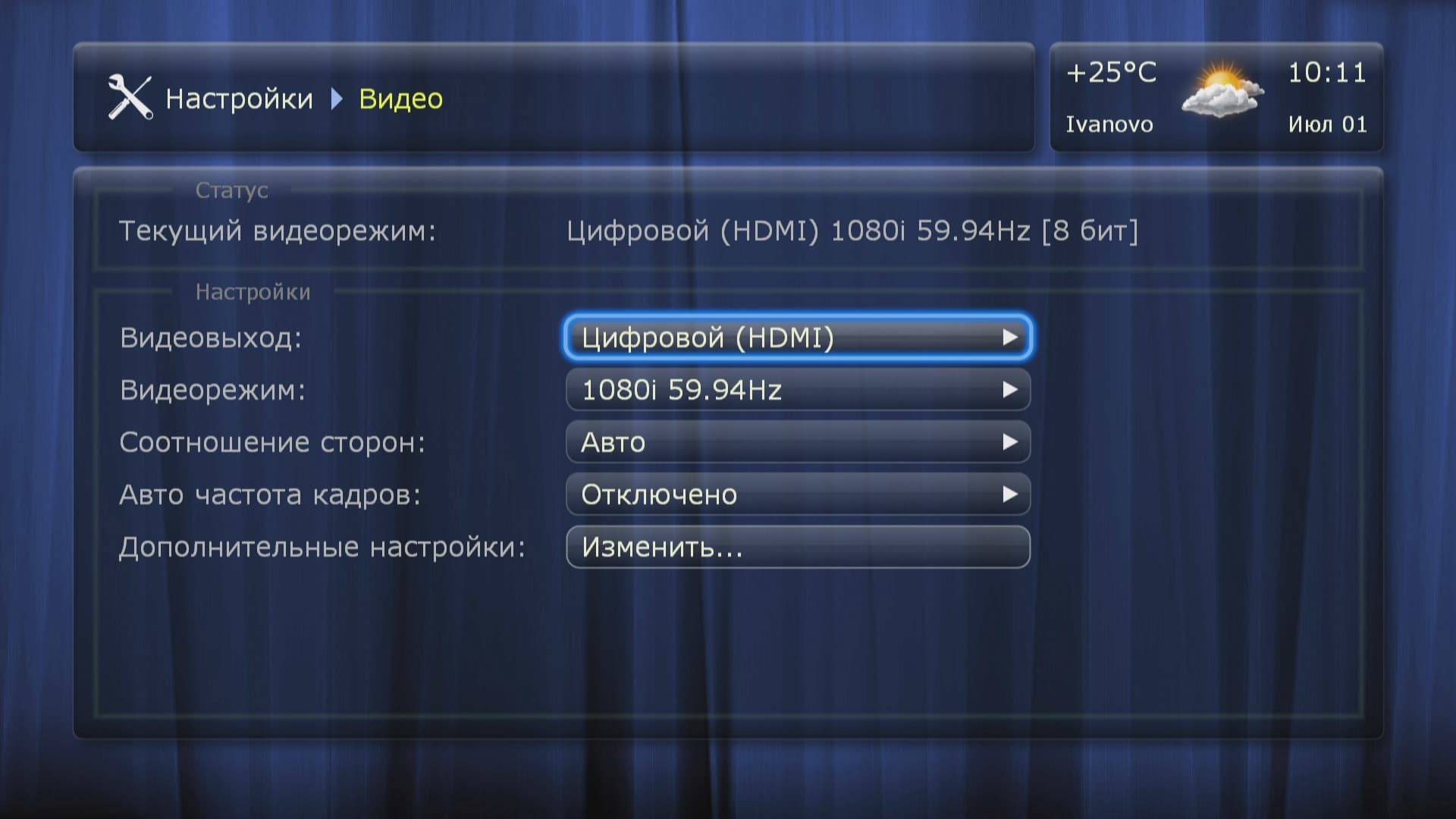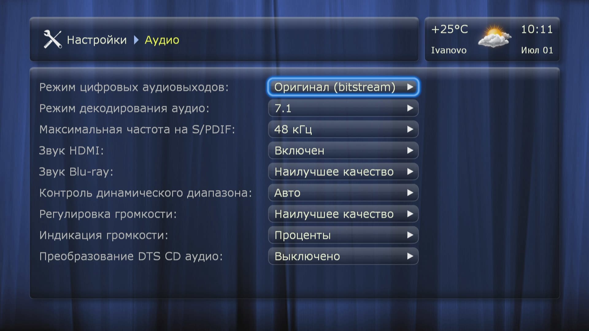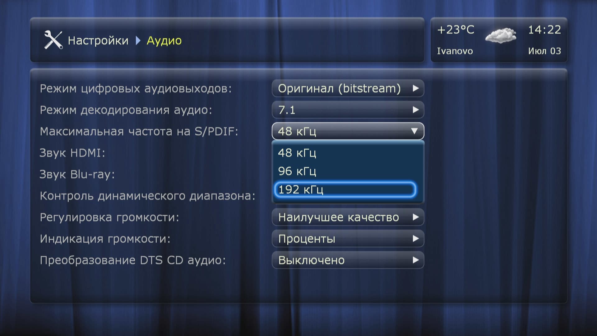 Отдельно следует отметить наличие нескольких популярных «компьютерных» разрешений экрана в видеонастройках, а также выбор режимов декодирования аудио (стерео, 5.1, 7.1) и максимальной частоты на S/PDIF (48, 96, 192 кГц).