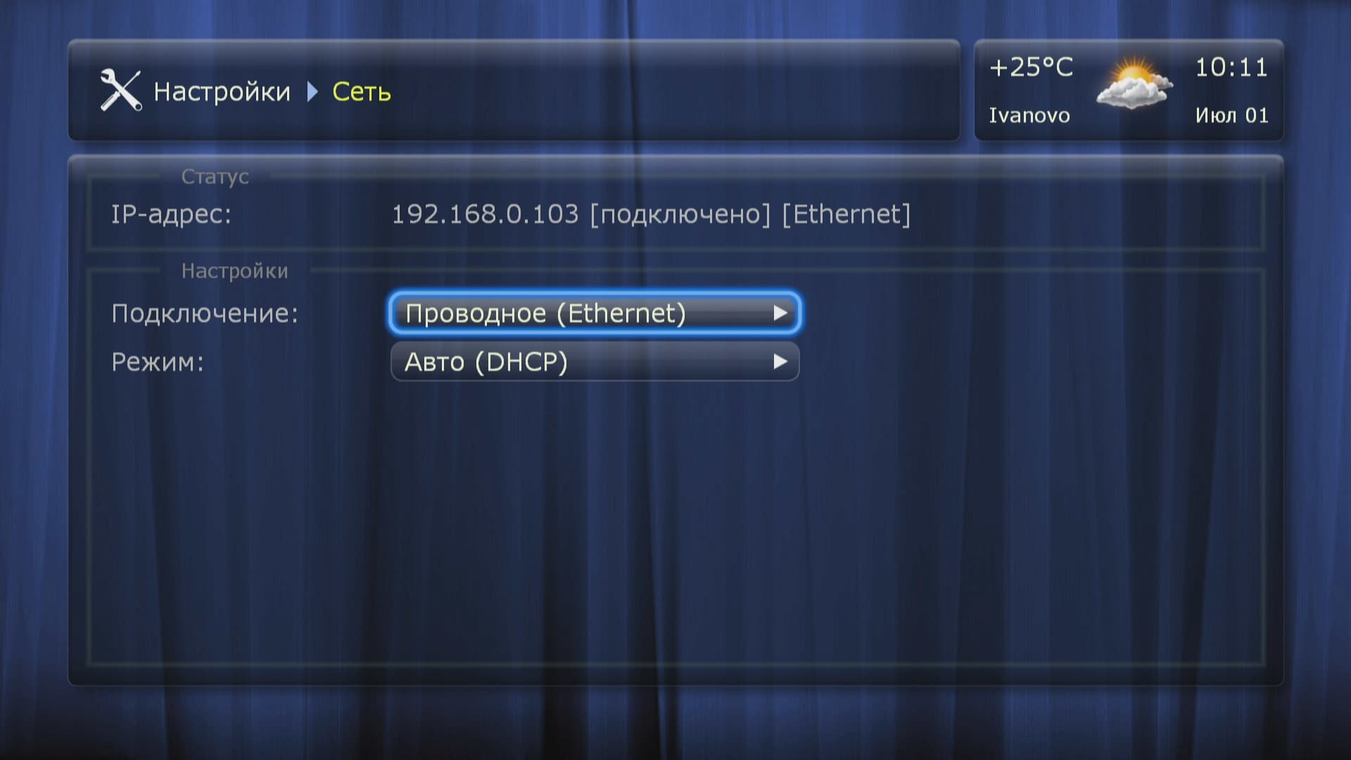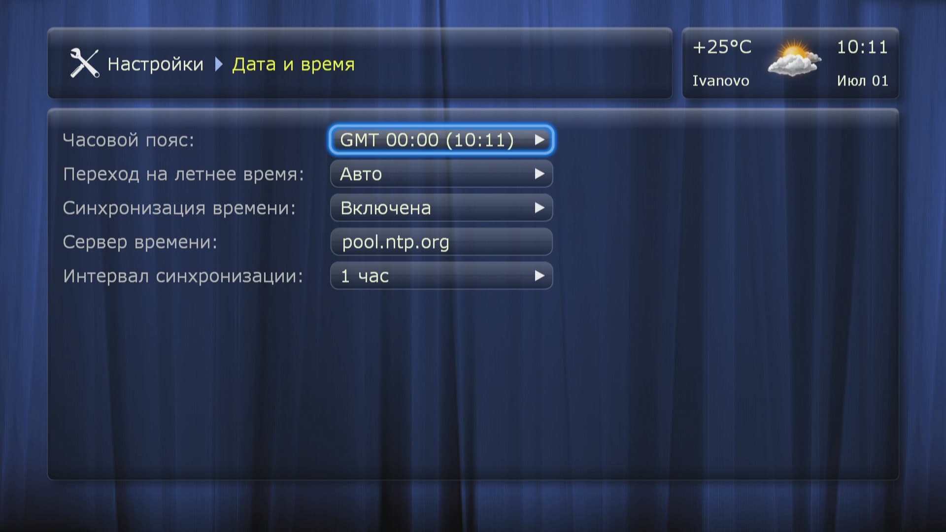 Язык интерфейса, экранная заставка, сброс настроек | Настройка даты, времени, а также автоматической синхронизации с серверами времени (разрешается ввести свой сервер) |