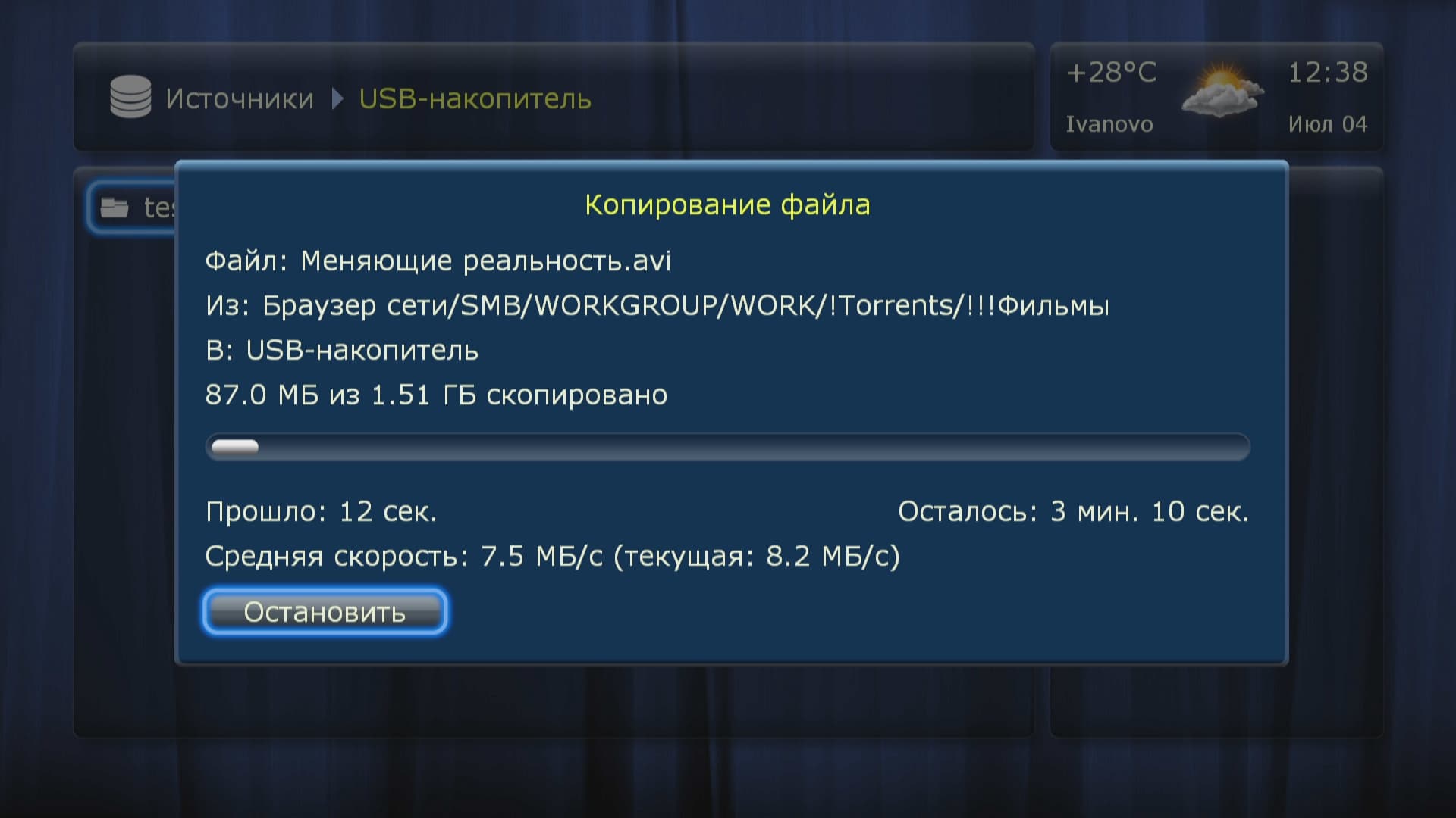 Закачиваемый файл располагается в папке Torrents на подключённом накопителе. Мощности процессора плеера вполне хватает на закачку торрента с одновременным воспроизведением Blu-ray-диска. Но тут, скорее всего, дело не столько в процессоре, сколько в грамотно распределённой загрузке. А за это целиком и полностью отвечает прошивка, написанная по всем правилам.