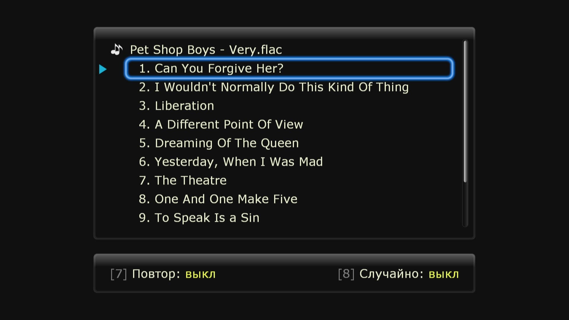 В данной версии прошивки имеется поддержка метаданных CUE при воспроизведении Monkey's Audio (*.APE) и Free Lossless Audio Codec (*.FLAC). Сведения отображаются в виде списка композиций нажатием кнопки POPUP MENU на пульте ДУ.