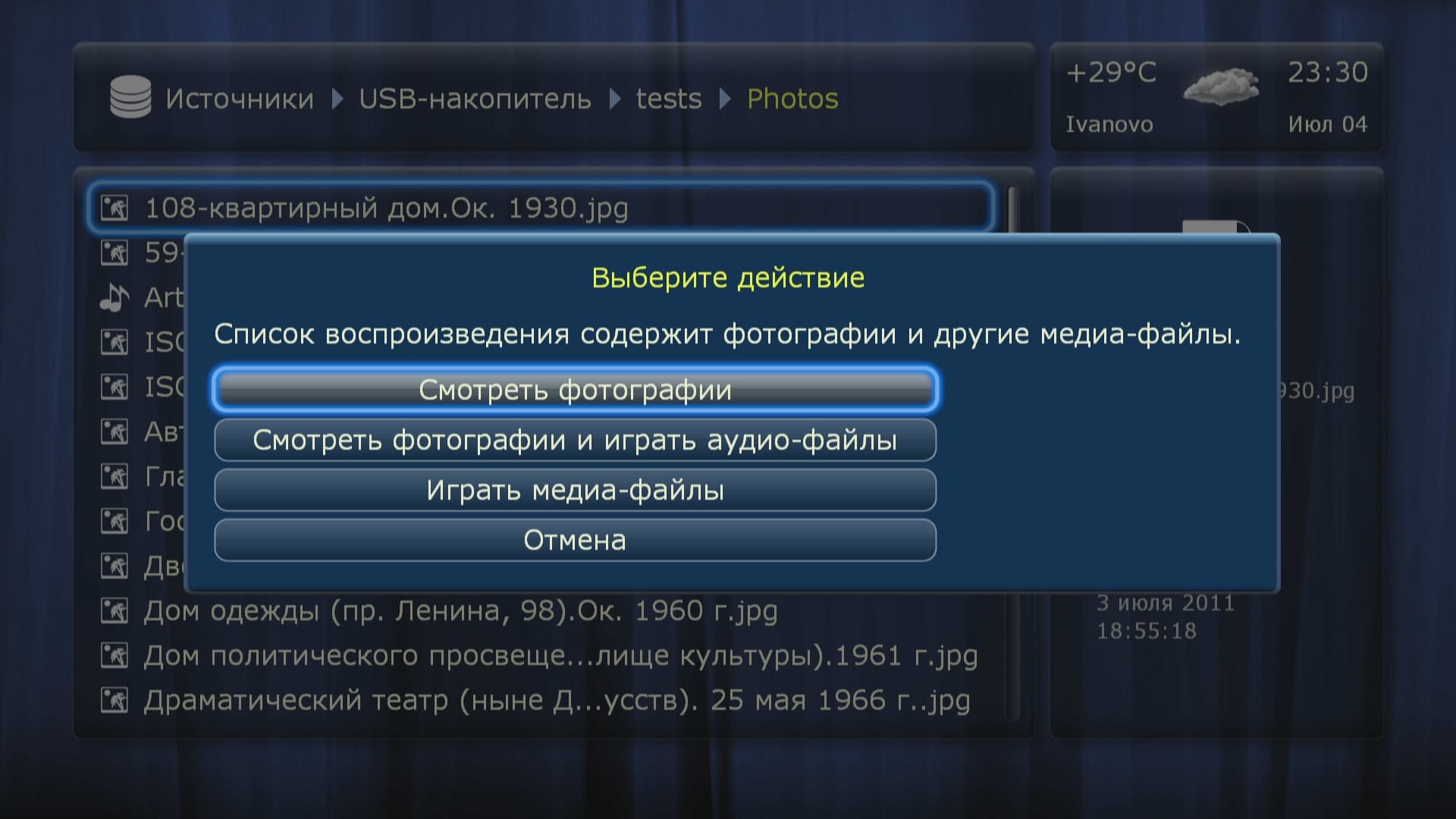 После этого знакомства с настроечными пунктами перейдём к просмотру имеющегося у нас материала, а заодно изучению новых возможностей прошивки, буде таковые имеются.