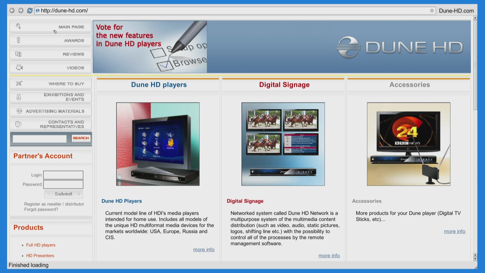 Веб-браузер запускается довольно долго, около минуты. Стартует он со страницы dune-hd.com, прописанной в качестве домашней. Навигация тут не совсем удобная, всё-таки не ПК, а плеер. Однако при помощи подключенной мыши и клавиатуры — вполне даже ничего.