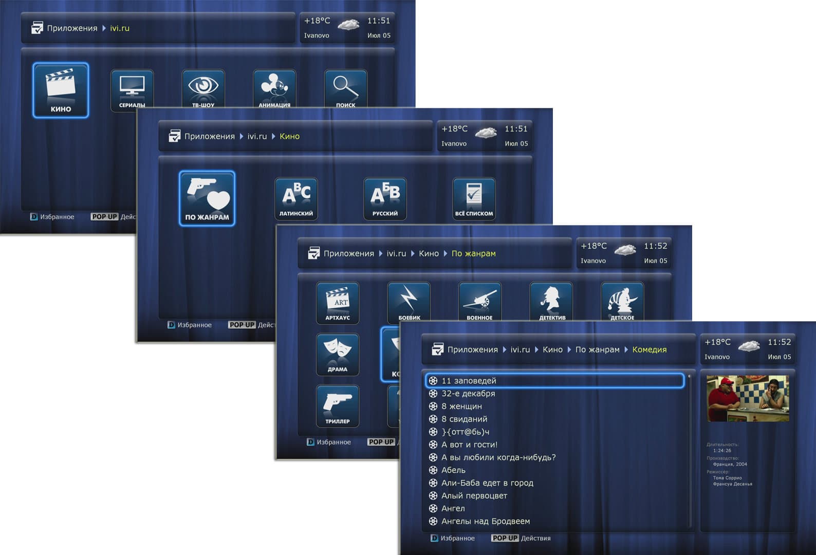 Пункт интернет-радио оказался таким же пустым, как и предыдущий IPTV. Зато ivi.ru, первый в России бесплатный видеосервис с лицензионным полнометражным контентом, может похвастаться наличием нескольких пунктов: Кино, Сериалы, ТВ-шоу, Анимация и Поиск. Каждый из перечисленных пунктов разбит на многочисленные подпункты, среди которых можно и заблудиться: сортировка по языкам, жанрам и, наконец, по названиям «произведений».