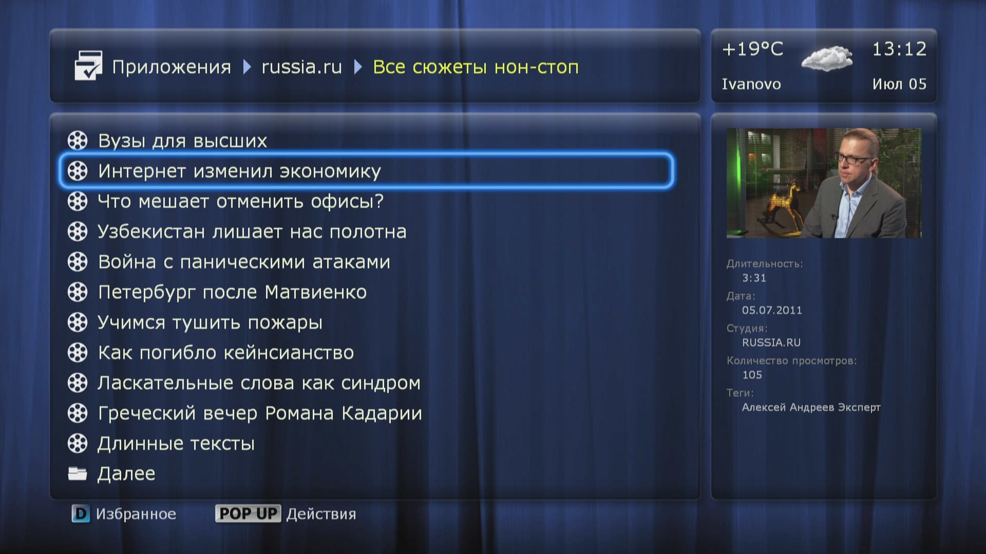 Предпоследний пункт в Приложениях — russia.ru. Этот ресурс и вовсе не требует рекомендаций: здесь собраны телепередачи, новостные, тематические ролики — всё, что угодно душе, желающей быть в курсе происходящего.