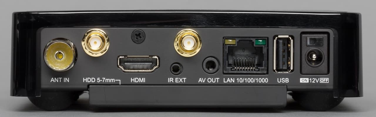 На переднем торце установлен один порт USB 2.0, а также приводится название устройства. За лицевой панелью также скрывается двухцветный светодиод статуса и приемник сигналов пульта дистанционного управления. Никакого дисплея в устройстве нет. Практически все остальные разъемы и порты находятся за задней панели. Она имеет относительно небольшую площадь на которой сложно найти свободное место.