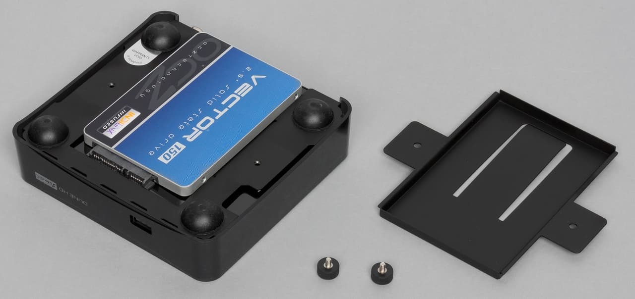 На дне плеера находятся четыре крупные резиновые ножки, а также специальный слот для установки жесткого диска формата 2,5″. Он рассчитан на модели толщиной не более 7 мм, которых сегодня большинство. Конечно, поддерживается и работа с SSD. Крепление позволяет относительно быстро поменять диск, но потребуется перевернуть корпус и открутить пару винтов с крупными головками. Так что проводить эту операцию с целью оперативной смены накопителя не получится.
