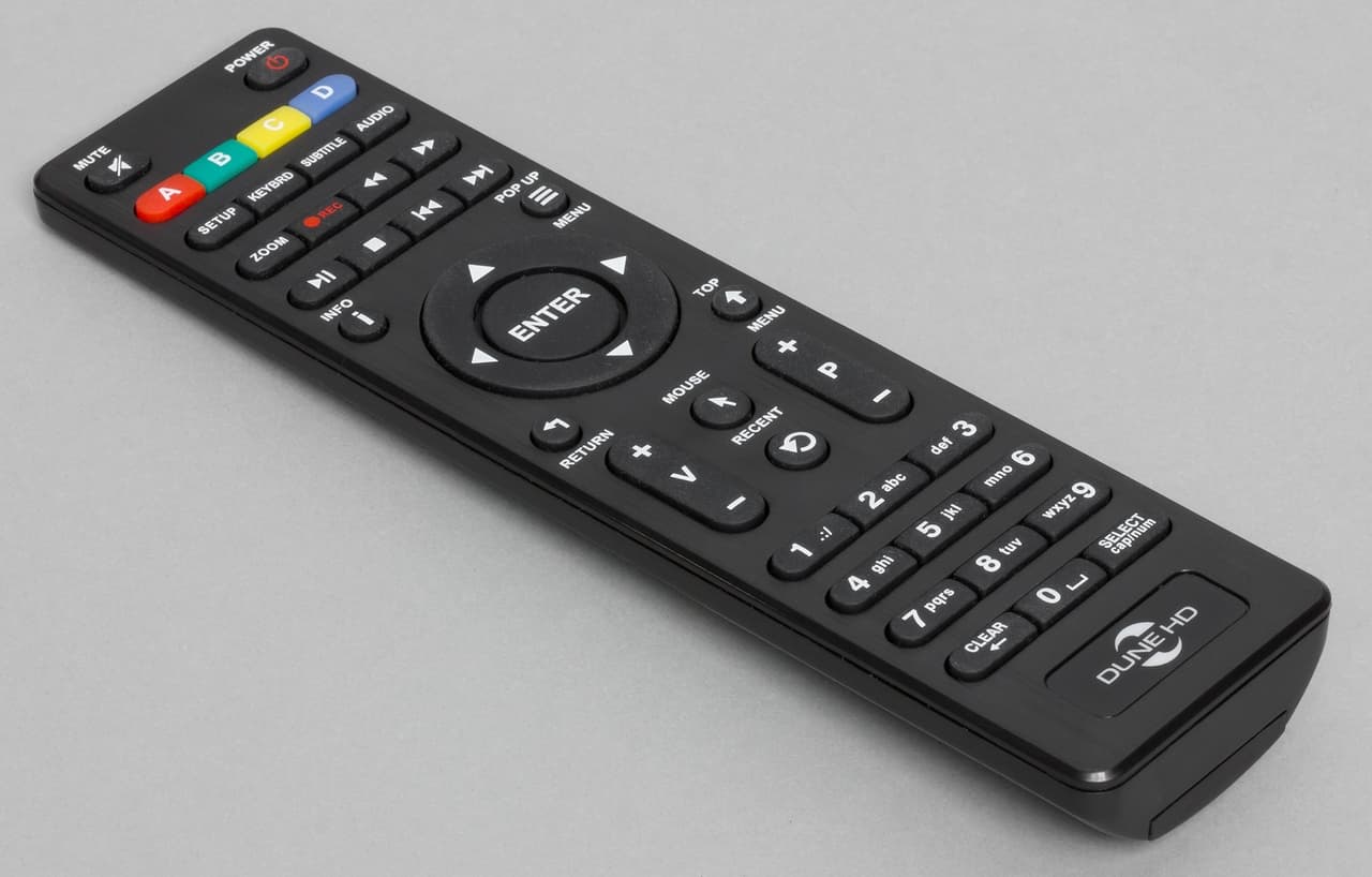 Сказать это можно и про комплектный пульт дистанционного управления, который очень похож на использованную для Dune HD Connect модель. Он имеет корпус из пластика, крупные размеры и удобно лежит в руке. Кнопок на пульте достаточно много, но их группировка позволяет легко привыкнуть к основным операциям без подглядывания.