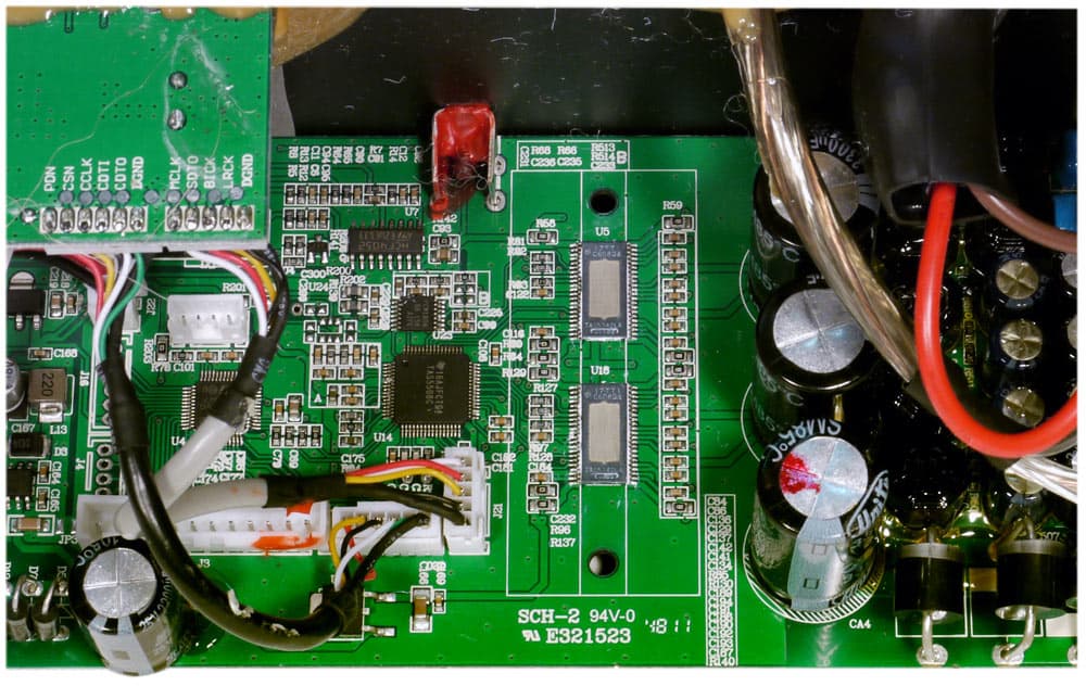Обработка цифровых сигналов производится микросхемой TAS5508C (8-канальный ШИМ для цифровой обработки аудиосигналов) под управлением микроконтроллера STM8L152. На их основе реализовано и частотное разделения каналов в виде фильтров 4-го порядка.