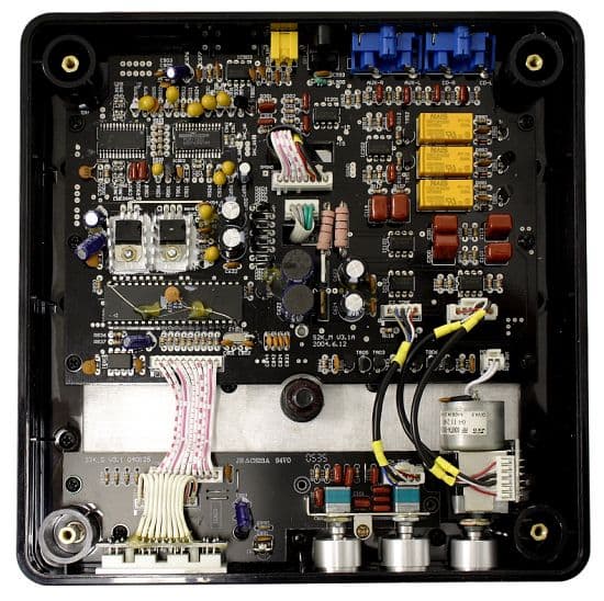 Интересной особенностью является моторизованный регулятор громкости. При регулировке громкости с пульта ручка на блоке плавно вращается с небольшой инерцией при остановке.