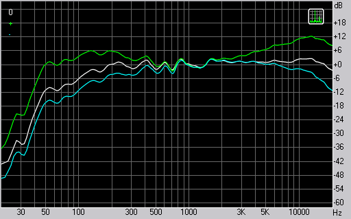 Здесь можно наглядно видеть работу регуляторов тембра. Судя по нашим измерениям, амплитуда сигнала может изменяться до 18 дБ на частотах 50 Гц и 15 кГц.