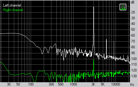 На приведенных спектрограммах мы можем отчетливо видеть, что действительно при подаче синуса уровень третьей гармоники низкий. При этом спектр сигнала чистый, и никаких паразитный гармоник, кроме второй и третьей, нет.