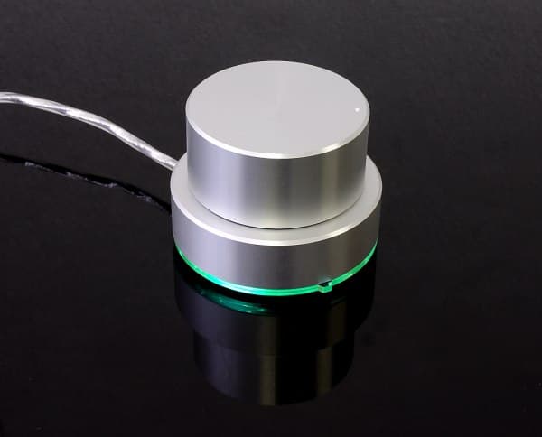 Пульт ДУ выполнен в очень оригинальном стиле и представляет собой регулятор громкости с выключателем питания. Пульт заключен в металлический корпус и снизу имеет подсветку светло-зеленого цвета. Подключение осуществляется проводом метровой длины к задней панели активной колонки.