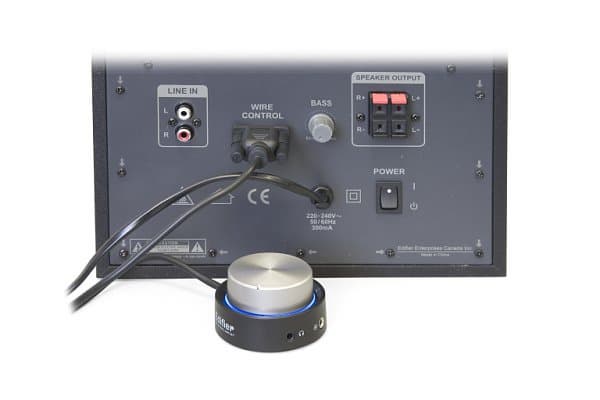 Для удобства управления, предусмотрен проводной пульт ДУ. Практически такой же используется в 2.1-наборе Edifier e3300. Отличия заключаются в подсветке. Если в e3300 индикатор питания горит красным цветом, в S2.1M — синим. С помощью пульта можно регулировать общую громкость набора, а в минимальном положении громкости происходит переключение в режим энергосбережения. Кроме этого, пульт оснащен выходом на наушники и дополнительным входом.