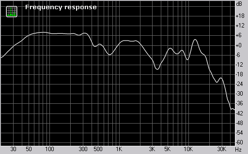 В заявленном производителем диапазоне частот неравномерность очень внушительная и составляет ±15 дБ. Однако даже если мы уменьшим диапазон до 20 кГц, значение неравномерности будет уменьшено всего до ±12 дБ.