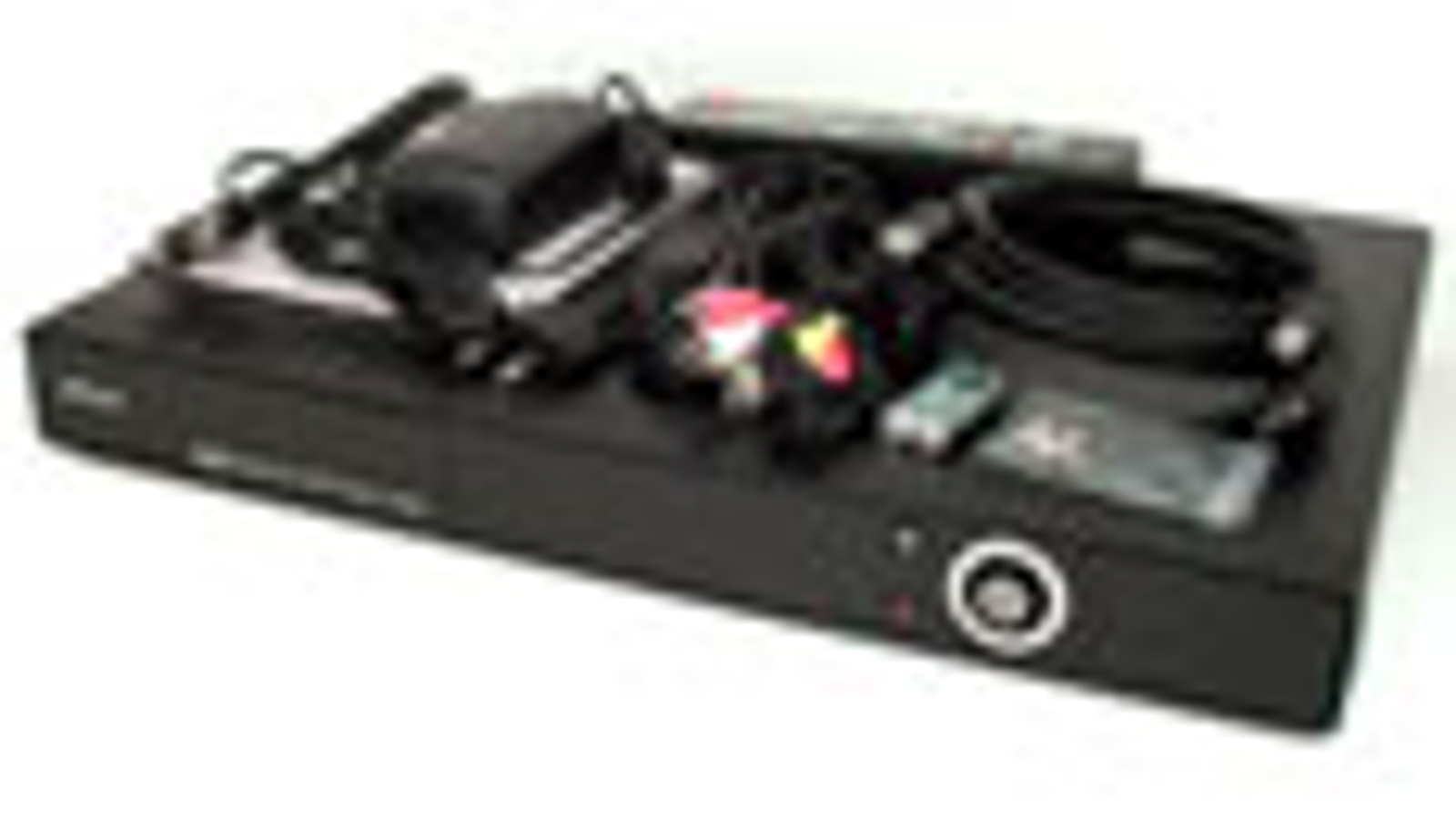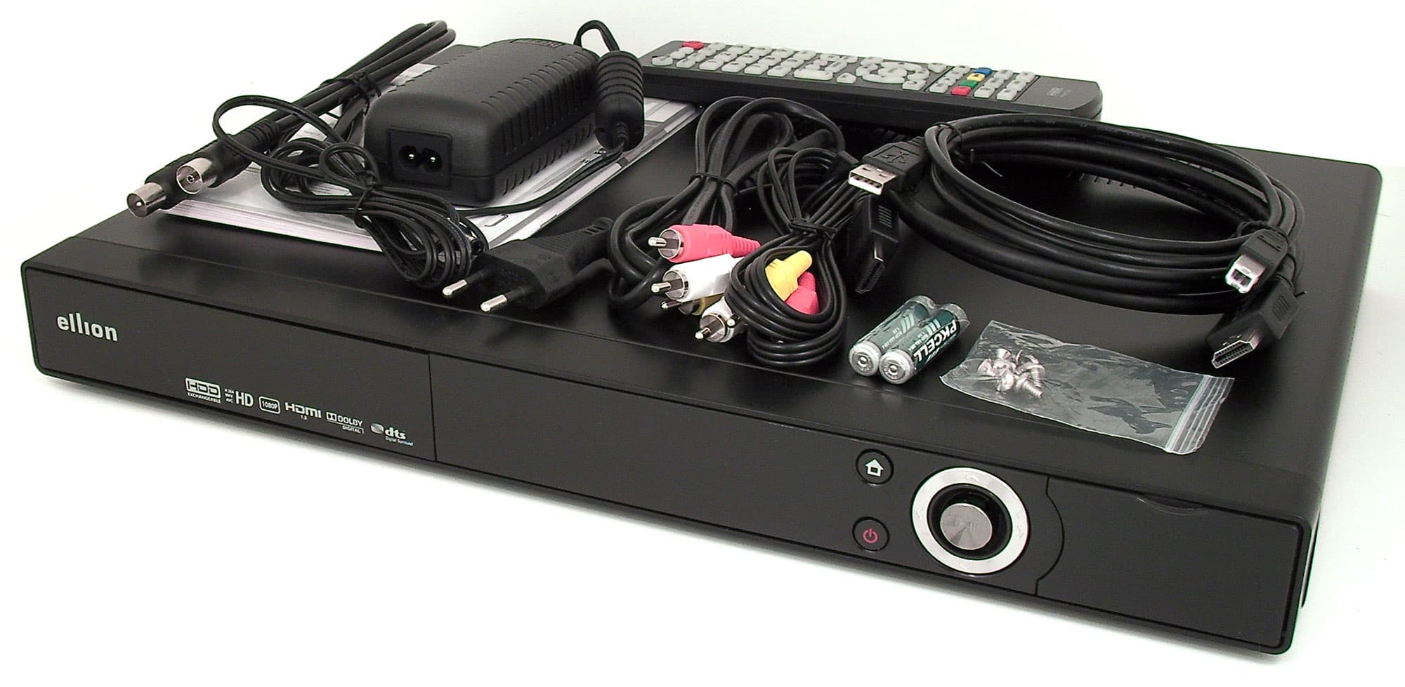В комплекте с рекордером имеется внешний блок питания с проводами, пульт ДУ с батарейками, несколько болтиков для монтажа жёсткого диска, инструкция и листовки на русском и английском языках, USB-кабель для подключения аппарата к ПК, композитный аудио/видеокабель, и — о радость! — кабель HDMI. Компонентного видеокабеля в комплекте нет.
