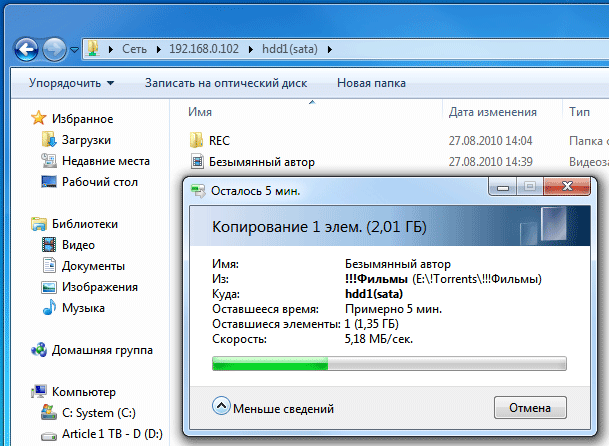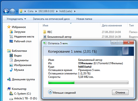 Копирование с компьютера на жёсткий диск плеера по проводной сети посредством SAMBA — до 6 МБ/сек.