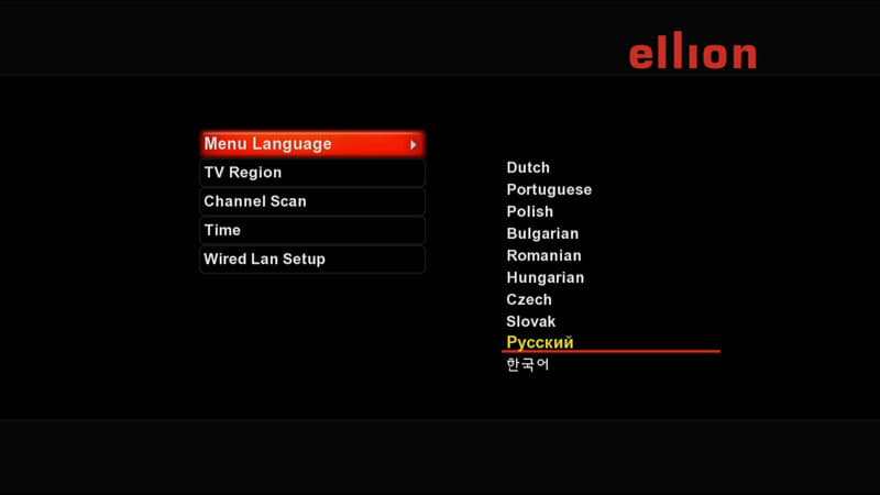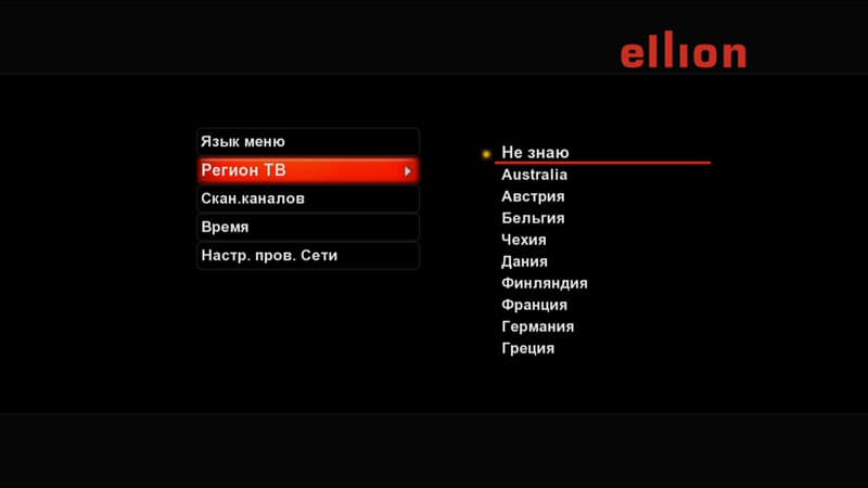 Выбор языка меню | Выбор региона ТВ. Что характерно: России в этом списке нет (появится в следующей прошивке). А потому оставим пункт по умолчанию — «Не знаю». Жаль, что отсутствует ещё один пункт: «А у меня нету», поскольку цифрового ТВ в месте написания обзора действительно не имеется. |