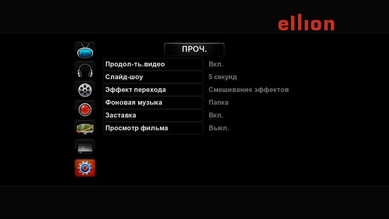 Нажатие кнопки SKIP на пульте приводит к перескоку воспроизведения на полминуты вперёд или назад. К сожалению, интервал этого перескока в настройках не регулируется (инженеры Ellion уже пообещали встроить такую настройку в будущие прошивки). | Увеличение скорости воспроизведения вперёд, на видеофайлах максимальная скорость 32x с шагом 1, 2, 4, 8, 16, 32; на аудиофайлах — 16x. |