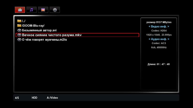 Браузер, запускаемый этой кнопкой, состоит из семи иконок: USB, CARD, HDD, Сеть, UPNP, Избранное, iRADIO.