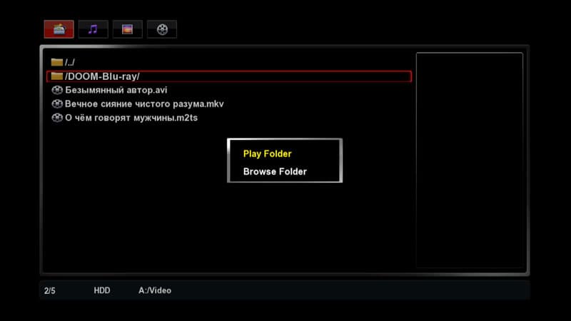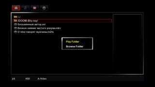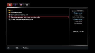 При выделении видеофайла в правой части окна отображается информация о размере кадра, кодеке и продолжительности фильма | При входе в любую папку плеер предлагает проиграть всё её содержимое, либо открыть для выбора конкретного файла |