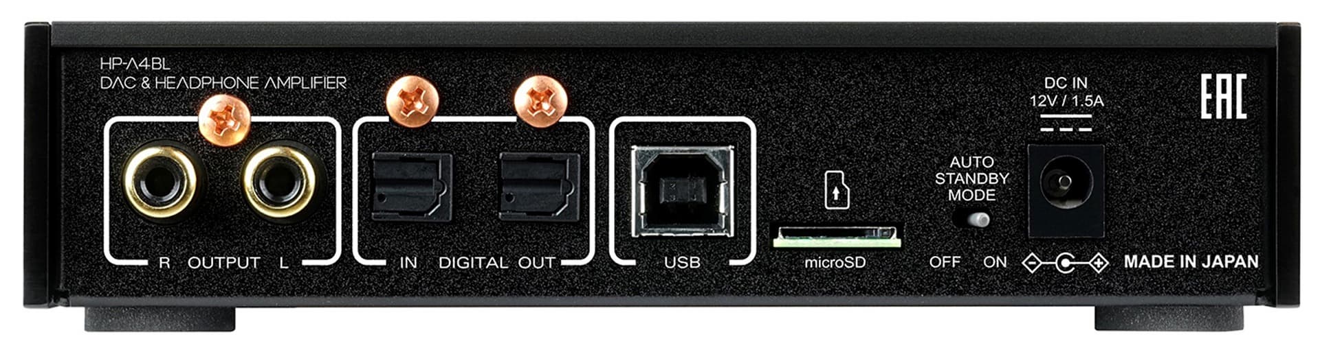 Главная особенность модели, ее отличие от версии A4 — одновременно и балансный, и небалансный выходы для подключения наушников. Работают выходы попеременно: если наушники подключены к небалансному выходу, то балансный отключается. Кнопкой Output Sel можно вообще отключить наушники и пустить сигнал на линейный выход RCA, расположенный сзади.